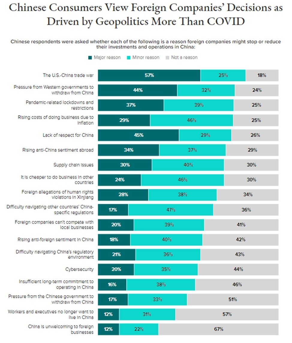 🔹Китайцы меньше всего склонны думать, что в уходе западных компаний виноват сам Китай. То, что Китай может враждебно относиться к иностранному бизнесу, находится в самом низу списка причин.
