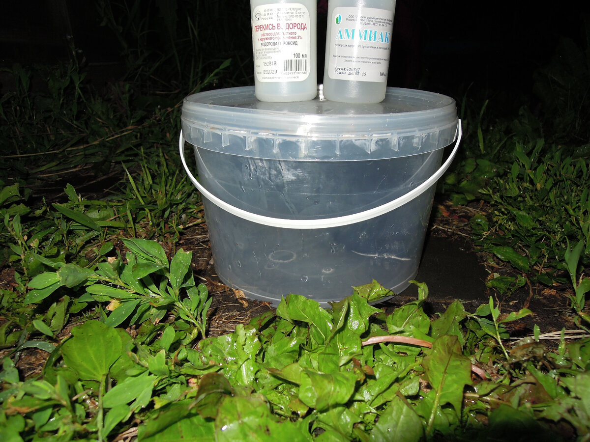 Открываем перекись водорода и поливаем ей наш колун, пока вся тряпка на нём не будет смоченной. Теперь всë тем же способом поливаем колун нашатырным спиртом, на данном этапе лучше задержать дыхание, вонь будет стоять, неимоверно ужасная. Даже не пробуйте снять респиратор! Теперь кладём наш "измученный" колун в сосуд (как уже говорилось я буду использовать небольшое ведёрко) и плотно закрываем крышкой. Всё, теперь можно снять респиратор и подышать свежим воздухом, ведь первый этап мы почти закончили. Осталось лишь подождать где-то 12 ( а лучше и все 24 часа) часов. Я же всё это сделал ночью, поэтому оставил инструмент ночевать на улице до следующего дня.