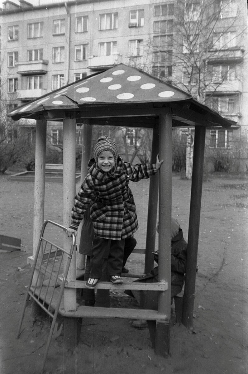 Обратите внимание на девочку, которая сидит и что-то держит в руках. Современный ребенок подумал бы, что у неё телефон. Но я не сомневаюсь, что у неё электронная игра, где надо было ловить яйца. Предел мечтаний советского школьника. О существовании каких-то компьютеров дети тогда не знали.