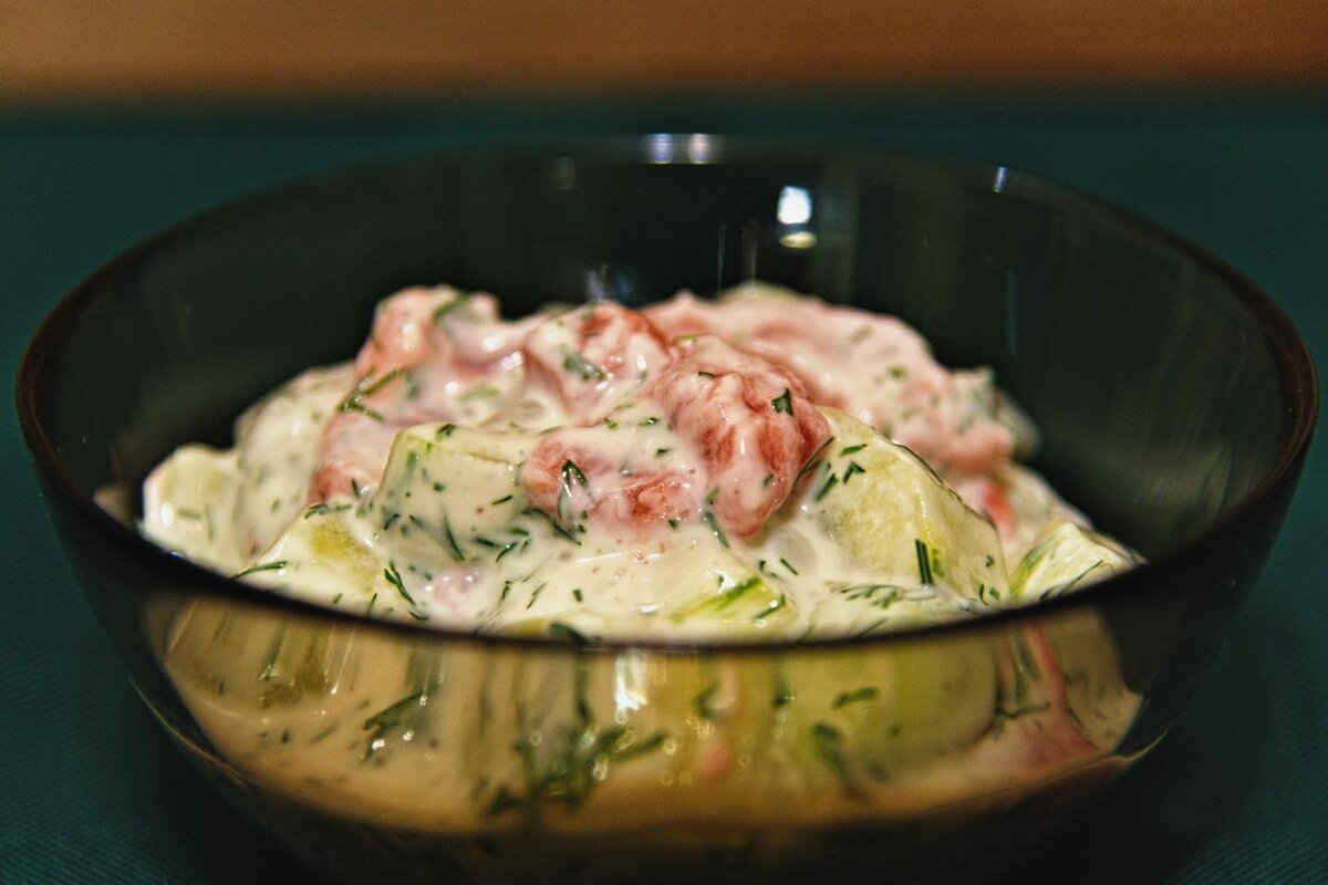 Ингредиенты: Огурцы помойте, почистите, удалите сердцевину с семенами и нарежьте на маленькие кусочки. Укроп помойте, оборвите веточки и тонко нарубите. Рыбу разберите на отдельные ломтики и нарежьте их узкими ленточками. Приготовьте заправку: соедините в отдельной емкости сметану, простоквашу, укроп, соль и перец, сахар и хорошо перемешайте. Соедините в салатнике огурцы, нарезанную рыбу, заправку, перемешайте и поставьте в холодильник на час. Салат готов! Приятного аппетита! Если Вам понравилась статья, Вы можете поставить «лайк» и подписаться на мой канал. Спасибо!