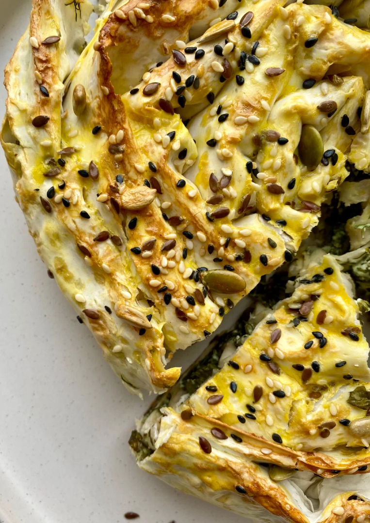 Делюсь рецептом летнего, вкусного и совершенно простого в приготовлении рецепта греческой улитки. Летний сезон в разгаре и те, у кого есть дачи, сады и огороды уже во всю собирают урожай свежей зелени, которая идеально подойдёт для данного рецепта. КБЖУ на 100 г: 192/8,4/9,3/20 Ингредиенты: Зелень, Сыр Фета, Лаваш, Оливковое масло, Яйцо и молоко - для глазури, Смесь семян для украшения Способ приготовления: Зелень помыть, просушить, мелко нарезать. Подойдёт любая, я взяла петрушку, укроп, шпинат, рукколу. Сыр раскрошить руками, добавить к зелени. Добавить 1 столовую ложку оливкового масла и тщательно перемешать. Лаваш порезать на полоски, выложить начинку и завернуть в рулет. У меня получилось два длинных рулетика. Выложить рулетики улиткой на противень или форму для запекания. Смазать смесью из яйца и молока, посыпать семечками. Можно использовать зубочистки, чтобы закрепить основу. Запекать в разогретой до 200 градусов духовке 15-20 минут до румяной корочки. Приятного аппетита!