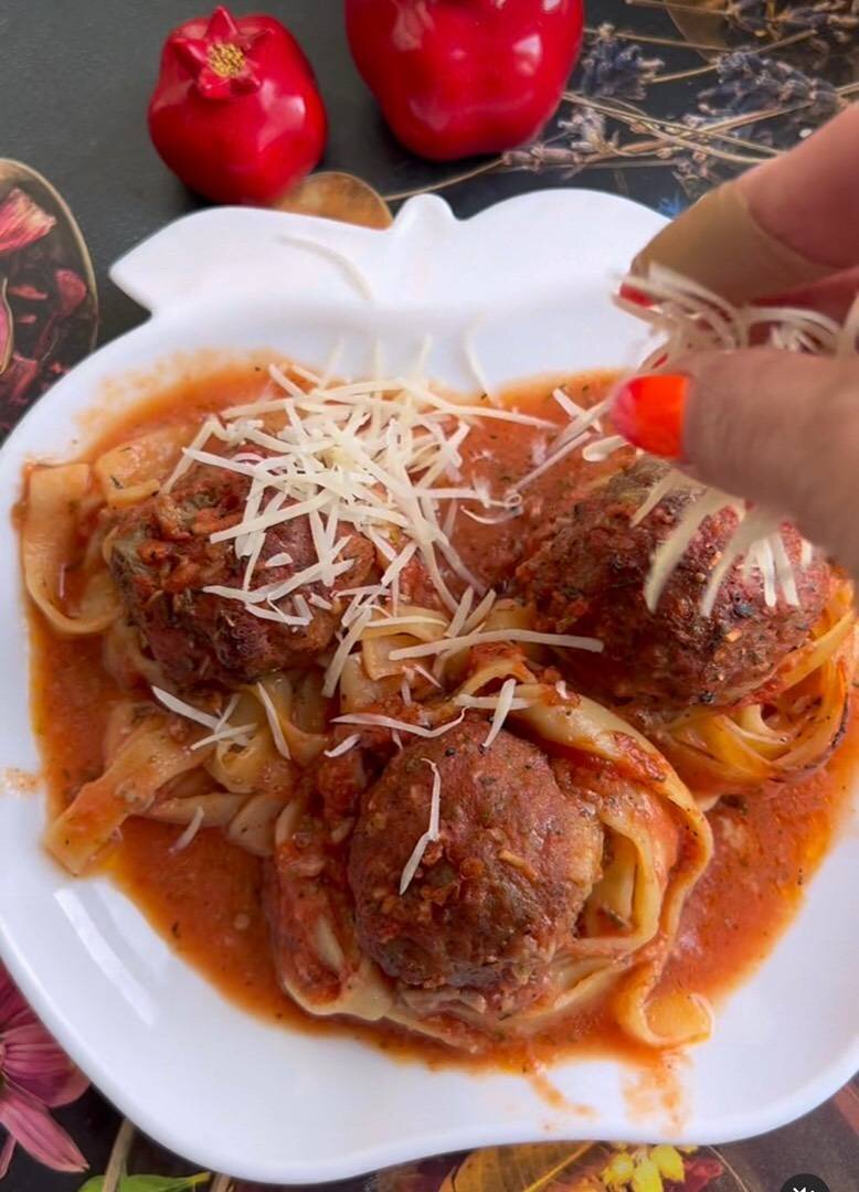 Ингредиенты: Гнезда тальятелли, фарша, протертых томатов, луковица, чеснока, Соль перец , Итальянские травы , копчёной паприки, сушеного чеснока, Оливковое масло, Пармезан Способ приготовления: Лук мелко шинкуем и обжариваем до мягкости на оливковом масле. Соединяем с фаршем,солью, перцем, сушеным чесноком и половиной трав. Вымешиваем и формируем шарики. В форму выкладываем гнезда, сверху - шарики из фарша. В протертых томаты добавляем соль, натёртый чеснок, паприку, половину трав, 3 ст л оливкового масла и около 200 мл воды. Поливаем наши гнезда,и ставим в духовку при 160 гр минут на 35-40. Аромат стоит на всю кухню! Если вы не очень любите - можно уменьшить количество итальянских трав. Выкладываем на тарелку, посыпаем пармезаном. Приятного аппетита!