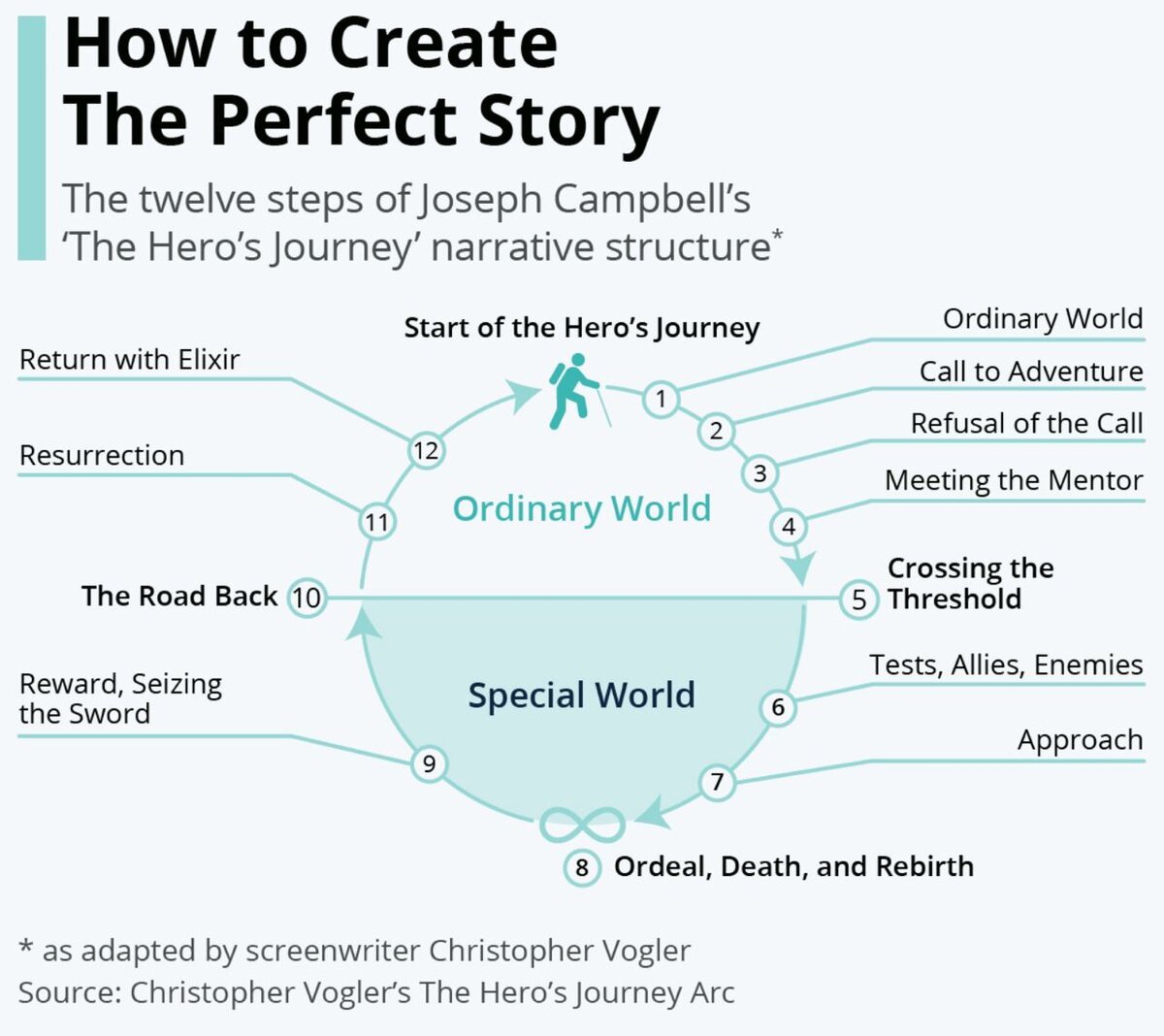 Всем привет👋 Сегодня разберем картинку о том как создать идеальную сагу! Сегодня День "Звездных войн". (4 мая) Чтобы отметить это, мы более внимательно рассмотрим, что именно делает фильмы такими замечательными, погрузившись в алгоритм самого повествования. Хотите верьте, хотите нет, но в "Звездных войнах" есть особый ингредиент, который присущ не только им одним. Она основана на мономифической повествовательной структуре, которая является ключом к успеху во многих наших любимых историях. Американский философ Джозеф Кэмпбелл подробно изучил идею мономифии и вывел ее на свет как ‘Путешествие героя’. В нем рассказывается история главного героя, который живет как в буквальном, так и в эмоциональном смысле, в пустыне скуки или тьмы, прежде чем их заманивают или заставляют отправиться в путешествие в другое царство, где они сталкиваются со зверями и должны противостоять своим собственным внутренним демонам. По пути они встречают наставника и получают какой-то магический талисман, будь то