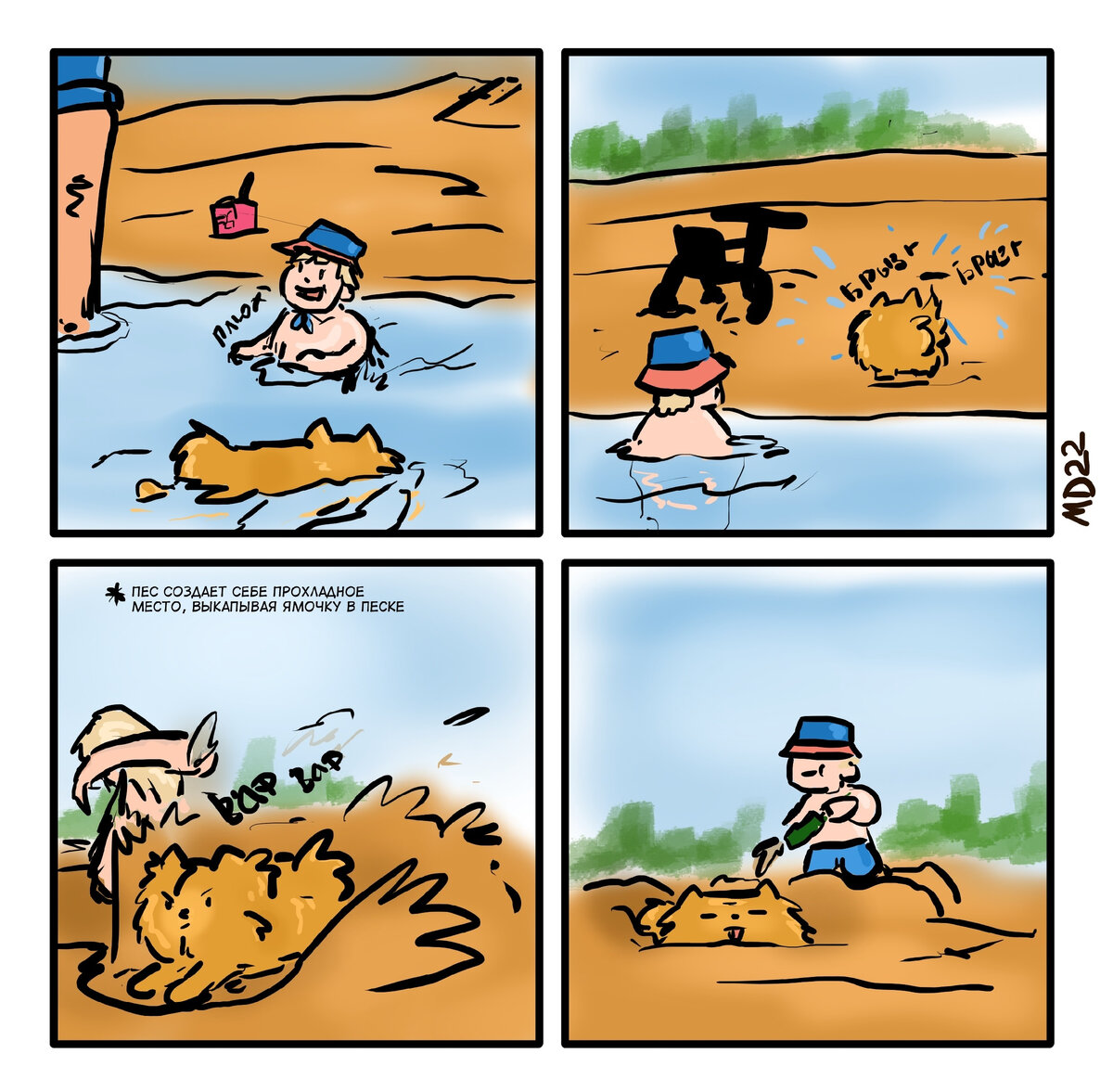 Малыш часто плещется в воде, когда пес делает заплыв, чтобы потом спокойно сушиться в песочной ямке. И когда пес выходит на сушу, малыш торопиться помочь ему погрузиться в песок