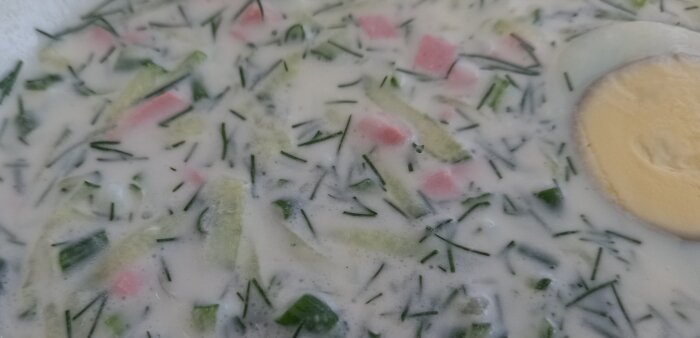 Картошку, кстати, никто добавить не мешает при желании. Основа для окрошки вполне обычная. Огурец я предпочитаю натереть на крупной терке, и жевать приятнее и огуречного сока больше. Еще обязательно укроп и зеленый лук порезать помельче. Ну и вареное яичко, тоже помельче нарубить. Еще редиска сюда нужна, тоже на терочке, но нет под рукой, к сожалению Мясная составляющая может быть любой. Мне больше нравиться вареная птица, курица или индейка, но в этот раз в холодильнике отыскалась вареная колбаска. Тоже не плохо А теперь заправка. Две хороших ложки сметаны, пол чайной ложки горчицы и соль. Все хорошо перемешиваем, чтобы разошлись соль и горчица. Получается вкусный салат, который уже можно было бы и съесть, но мы не будем Мы достанем из холоди
