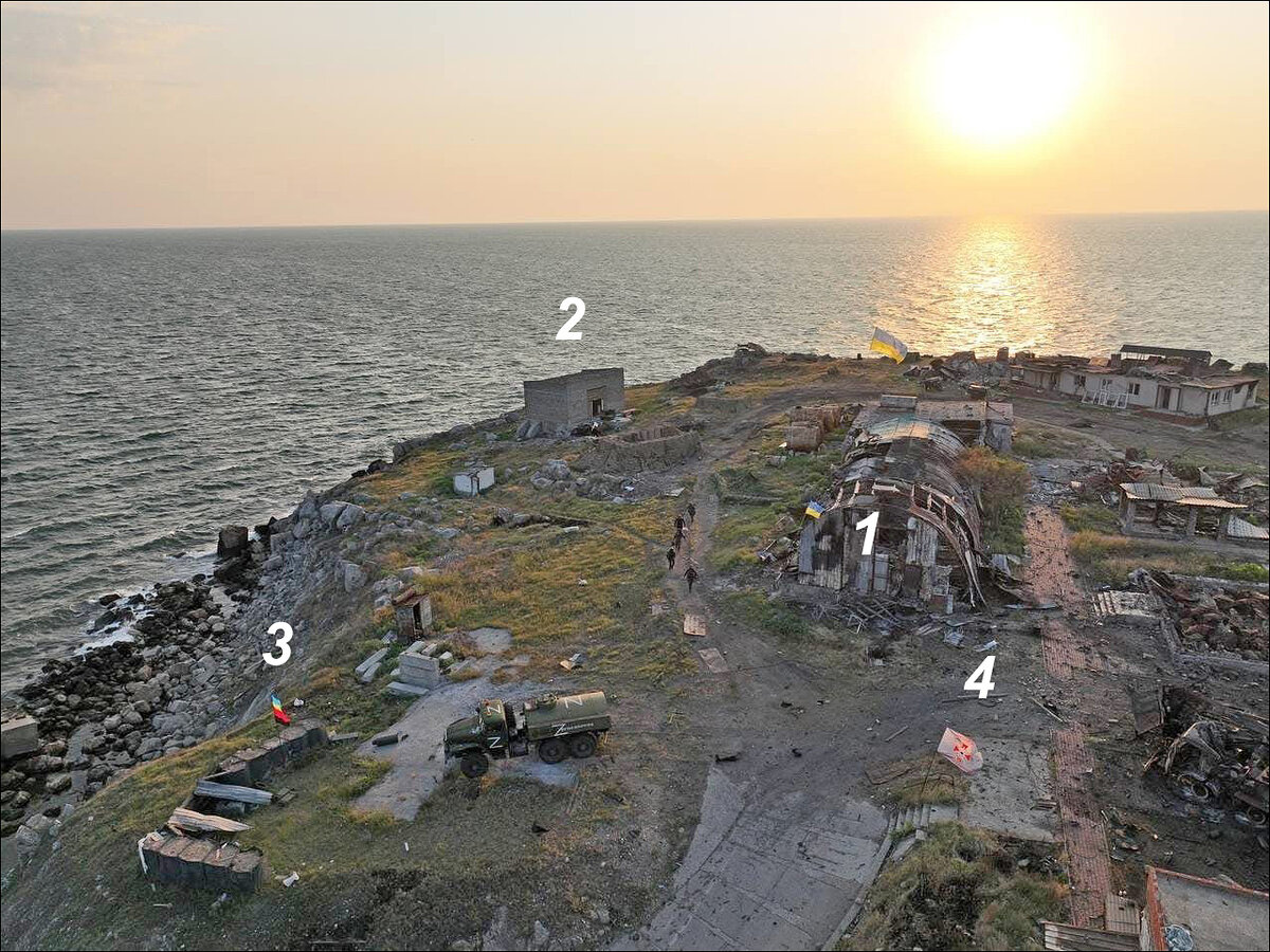 Итак, вчера, согласно заявлению генерала Конашенкова, "Около 5 часов утра несколько украинских военных высадились на остров с моторной лодки, водрузили флаг и сфотографировались с ним. Самолетом ВКС России был немедленно нанесен удар высокоточными ракетами по острову Змеиный, в результате которого часть украинских военнослужащих была уничтожена. Те военные, что остались в живых, сбежали в направлении Приморского Одесской области". Сколько не искал, такой фотографии в интернете не нашёл, может, кто-нибудь видел? Зато есть несколько снимков в процессе водружения флагов. Именно во множественном числе, потому что всего я их насчитал 5 штук. Вот общий снимок, где все они видны, очень желательно кликнуть мышкой, чтобы разглядеть подробности: Вот устанавливается большой флаг, на первом снимке он самый дальний: Вот флаг поменьше, солдат карабкается на ангар, обозначенный на первом снимке цифрой 1: Цифрой 3 обозначены сразу два флага: национальный и бандеровской УПА. Цифрой 4 - флаг ВСУ. Снимки