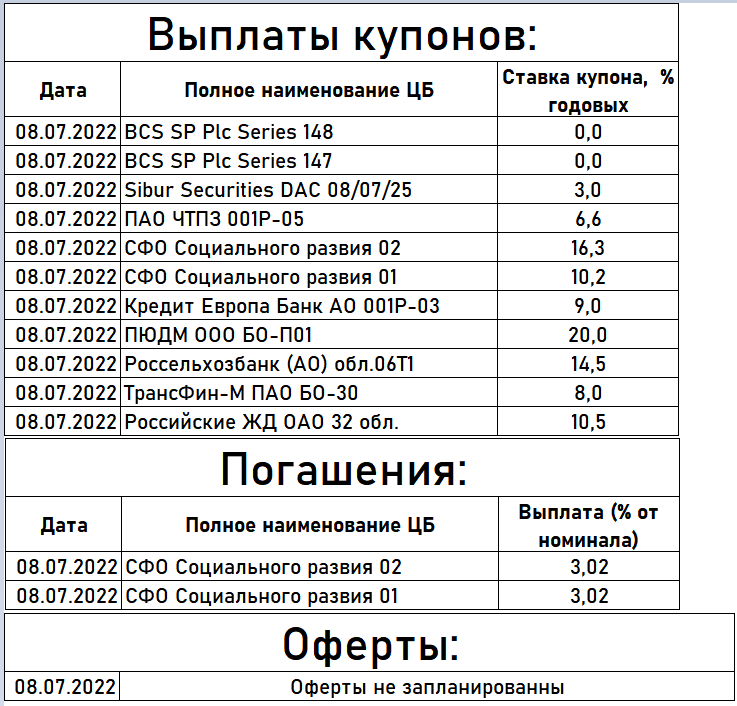 Выплаты, оферты и погашения облигаций на текущей неделе: сегодня 08.07.2022 года.