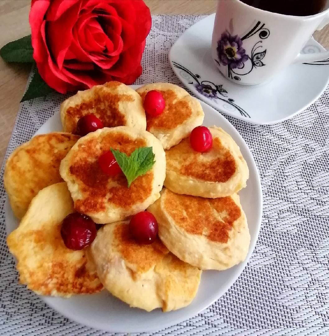 #меню Ингредиенты: творога, яйца, абрикосов (вес нетто), сахара, муки (у меня дурум из тсп), Ванилин, Масло топлёное для жарки Способ приготовления: Творог пробиваем блендером до пастообразного состояния, абрикосы превращаем в пюре. Добавляем к творогу яйца, сахар, пюре абрикосовое, муку и ванилин, хорошо перемешиваем. Масса должна быть консистенции густой сметаны. Количество муки регулируем (мука разная). Сковороду разогреваем, смазываем маслом. Выкладываем столовой ложкой оладьи. Жарим под крышкой на слабом огне с двух сторон до готовности.