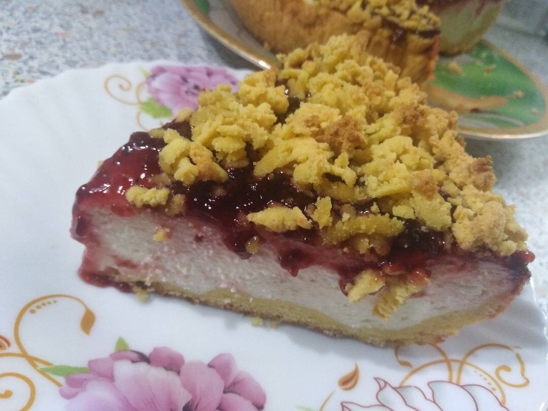 #кукпадготовит Ингредиенты: тесто:, кукурузная мука , сахар , соль, масло сливочное , яйца куриные, разрыхлитель , начинка:, творог 9% , сметана 20 % , яйца куриные, ванилин, сахар , кукурузный крахмал , малиновое желе Способ приготовления: Кукурузную муку соединить с сахаром, солью и разрыхлителем. Перемешать. Добавить размягченное сливочное масло. Перетереть руками в крошку, вбить яйцо. Замесить тесто, разделить на две неравные части. Меньшую часть убрать в морозилку на 30 минут. Большую положить в холодильник. В творог добавить сметану, яйца, ванилин, сахар и кукурузный крахмал. Пробить блендером до однородной массы. Охлажденное тесто выложить в форму застеленную фольгой. Разровнять, сделать бортики. Выложить творожную массу. Сверху малиновое желе. Разровнять по поверхности. Посыпать натертым, замороженным тестом. Поставить в разогретую духовку. Выпекать при 190 градусах 35 минут. После выпечки дать пирогу полностью остыть. Приятного аппетита!!!