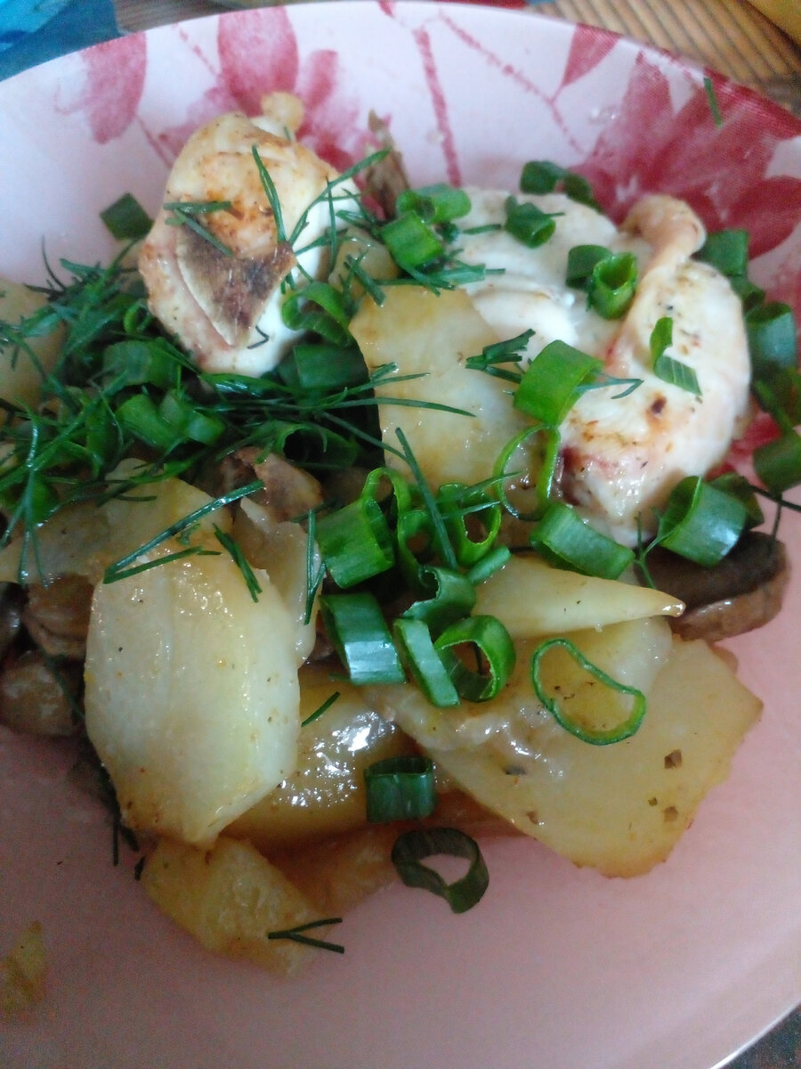 Всем доброго дня,дорогие подписчики и гости моего канала!!! Сегодня поговорим о приготовлении блюда,который прекрасно подойдет,когда мало времени,а накормить нужно людей) Для этого блюда нам нужно: Приготовление: Картофель очистите и нарежте дольками среднего размере.Грибы промойте от грязи и песка,нарежти дольками.Курицу разделите на сигменты,лук полукольцами и сложите все в один противене.По солите,по перчите ,хорошенько все перемешайте и отправляйте в духовку на 40-45мин. при температуре 220градусов. Если есть желание и возможность можно добавить сметаны грамм 200,но не обязательно.) При подачи посыпьте нарубленной зеленью Знаю,многие скажут,что это обычное всеми блюдо,ЧАСТИЧНО я с этим соглашусь. Однако Нет ни одного другого блюда,который посостязается по вкусу,каллорийности,времяни готовки,а главное аромату, Который издается при открывании духовки))) Это не передать словами,нужно брать и пробывать готовить своими руками)ПРОБУЙТЕ Приятного всем апптетита,подписывайтесь на канал,с