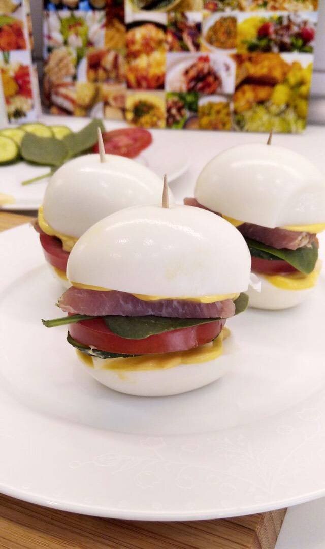 Ингредиенты: яйца, помидор, огурец, Листья салата, Сырный соус, Сыр, сыровяленой свинины Способ приготовления: Яйца отварить, охладить, почистить и разрезать пополам. Я ещё у одной половинки немного срезала сбоку, чтоб не падали при подаче. Огурец и помидор порезать кружочками, помидор выбирайте небольшой, чтоб был по размеру яйца. Сыр тонкой пластиной, тоже под размер яйца. Собираем бургер: берем одну половину яйца желтком вверх, смазываем соусом, кладем огурец, помидор, лист салата, мясо или колбасу, смазываем соусом и закрываем второй половиной яйца. Прокалываем зубочисткой чтоб все держалось. Закуска готова.