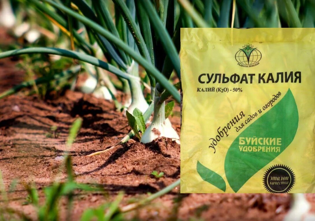 Качество луковиц, их размер и как они будут храниться во многом зависит от ухода за луком в июле. Именно в этом месяце нужно провести последнюю подкормку лука, чтобы головки выросли большими и плотными. В июле подкормки кардинально меняются. Растению не нужен азот, поэтому никаких зеленых удобрений и настоев коровяка или куриного помета. Если продолжать так подкармливать, то время созревания растянется, перо будет зеленым, шейка толстой, а луковицы, увы, мелкими. Азот в июле плох еще и тем, что головки станут рыхлыми и водянистыми и будут плохо храниться. Лучшее удобрение для лука в июле В июле перья пожухают, а луковицы наоборот набирают в объемах, вылезая из земли, идет активное уплотнение шелухи. В это время луку для вкуса, сочности и плотности нужны калий и фосфор. Эти элементы содержатся в таком удобрении как сульфат калия. Именно им и нужно подкормить лук. Удобрение не содержит азот и остается одним из самых доступных. Приготовить раствор очень просто. Достаточно всыпать столову