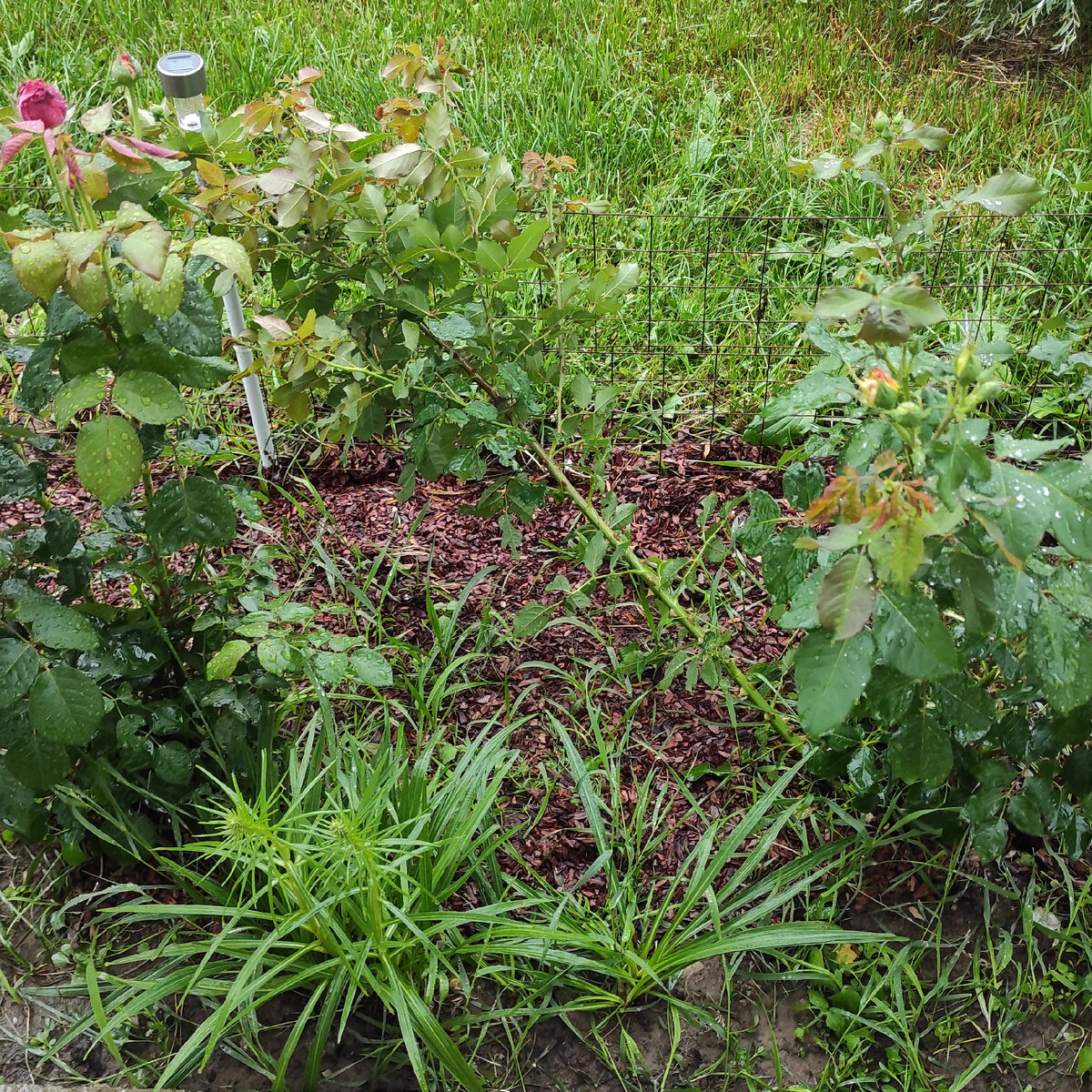 После продолжительной жары, когда мы жили практически в режиме традиционно жарких стран (ранний подъëм, послеобеденная сиеста, возвращение к жизни вечером), на нас обрушился ливень. Все предыдущие дни, дождевые облака, как заговорëннные, обходили нас стороной. Смотришь прогноз осадков и думаешь: вот, вот сейчас прольëт. Но нет, странный хитрый манёвр и льëт по всей округе, но не у нас. Дождались. Растения, от мала до велика, трепало безжалостно и опасно. Утром пошла оценивать ущерб. Самый большой обутоненный побег розы Карамель сломался на уровне земли. Лежит на ограждении. Опора манчужского клематиса не выдержала, завалилась. Клематис лëг на папоротники. Править нужно сегодня. Чубушник и гортензии разметало и растрепало. Если за два-три дня кустарник не соберётся - буду собирать сама. Плетистая new dawn из аккуратного цветущего растения превратилась в непонятно что. Как подсохнет - буду еë заново подвязывать (а она злющая, между прочим, колючая очень) Даже стойкая кустовая ива б