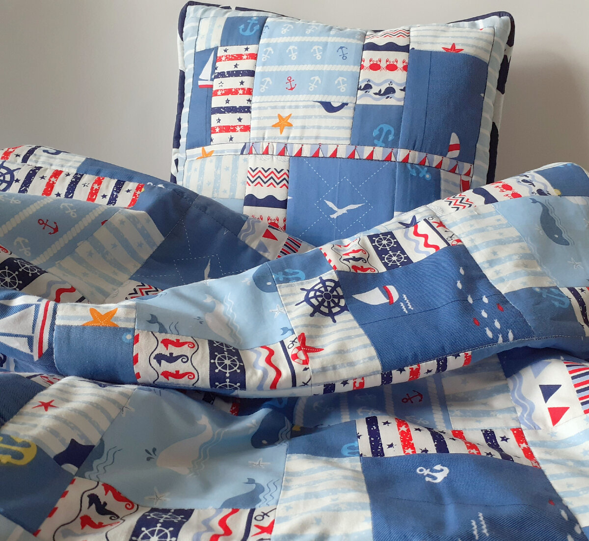 У вас бывало такое. что просто хочется пошить? В запасах лежали ткани и более года ждали подходящего случая. Коллекцию в морском стиле из отрезов ткани 50 х 55 см. приобрела на известном китайском сайте. Принты понравились, хороший вариант для детского одеяла - покрывала. Радовалась когда получила, но плотность ткани у разных отрезов отличается. Более светлые ткани тоньше, это и сказалось на качестве работы впоследствии. Долго искала схему для одеяла которая бы меня устроила. Просто сшить квадраты мне было не интересно. Лоскутный марафон сам нашёлся, бесплатное предложение, с 1 июня. Предложили сшить 4 одеяла за 2 месяца. Конечно я вписалась. Осилила только первое. Зацепилась за предложенную схему с блоком 9 квадратов и разрезалки. Видео-уроки мне помогли пошагово сделать работу от начала до конца. Общение в чате - осознать то, что нас таких много. Впечатление от марафона - люди хорошо подготовились. Программа, содержание, отношение, организационные моменты на высоком уровне. Сп