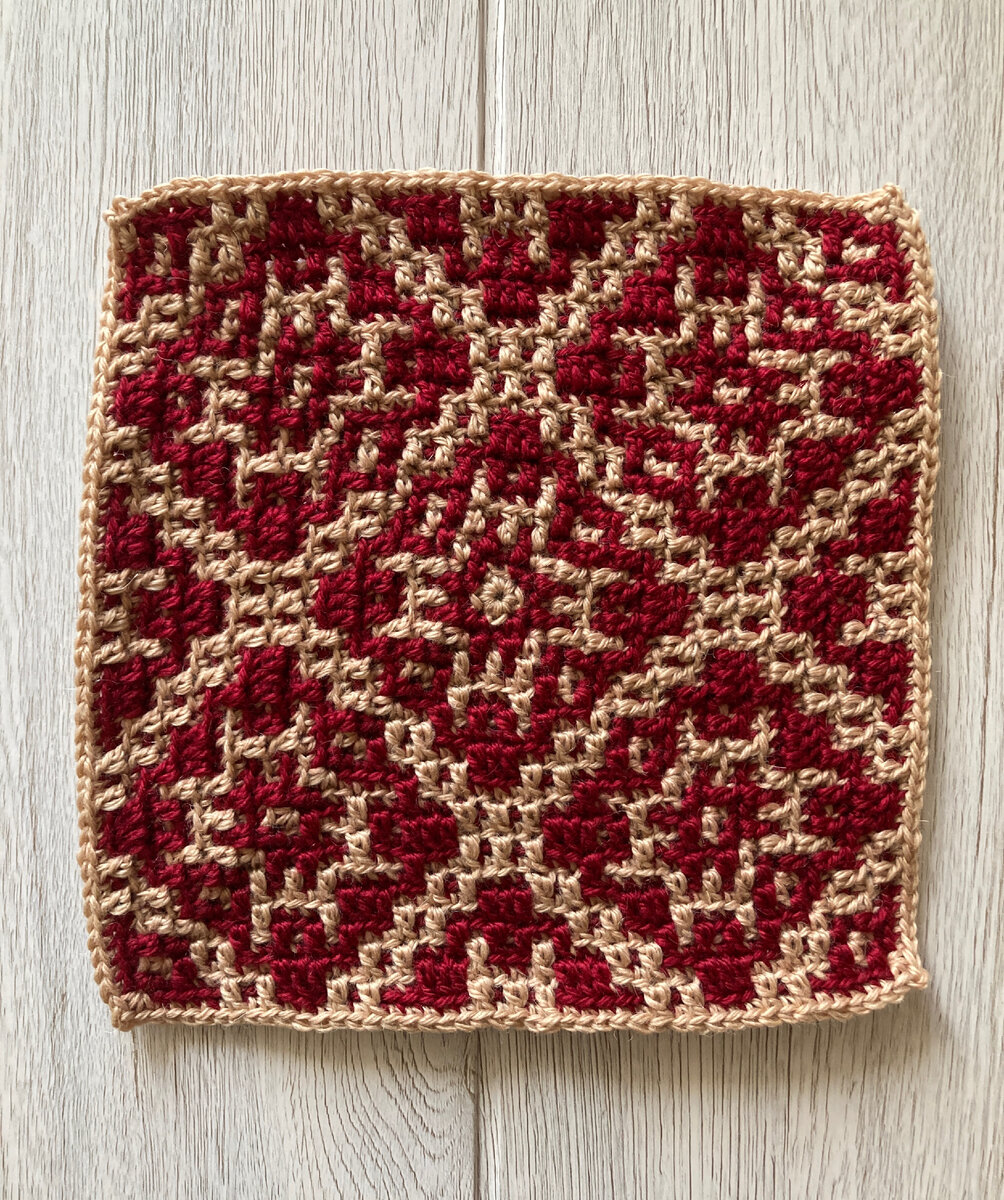 Здравствуйте, дорогие рукодельницы! Сегодня у меня связался вот такой красивый мотив в технике мозаичного вязания крючком. В поисках интересных узоров для мозаичного вязания крючком попалась мне на глаза вот такая схема. Судя по фотографии, это страница из книги, поискав в интернете, ничего такого не нашла, но таких страниц с другими схемами много. Эта схема предназначена для вязания в технике "ленивого" жаккарда спицами, на её основе я нарисовала схему для крючка и для её проверки связала образец, вот что получилось. Схема для прямого мозаичного вязания крючком, вяжется только по лицевой стороне с обрывом нити в каждом ряду. Условные обозначения: + - столбик без накида; пустая клетка - столбик без накида за заднюю стенку; х - столбик с накидом, провязанный за горизонтальную перемычку на ряд ниже; примечание: смена цвета нити в каждом ряду, в конце ряда нить обрывается, протягивается через петлю. В образце три кромочных петли, провязывала столбиками без накида за обе стенки, в начале