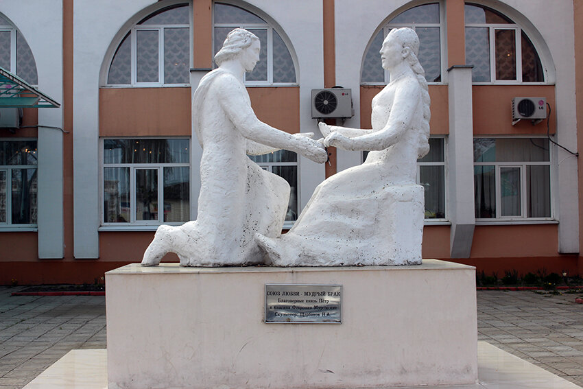 Первый памятник Петру и Февронии появился в Муроме. 8 июля 2008 года возле муромского ЗАГСа открыли памятник, носящий официальное название "Союз любви - мудрый брак". Скульптура получилась в стие "а-ля Советский Союз". Я бы так и думала, что это привет из Советского прошлого, если бы не знала дату открытия памятника.