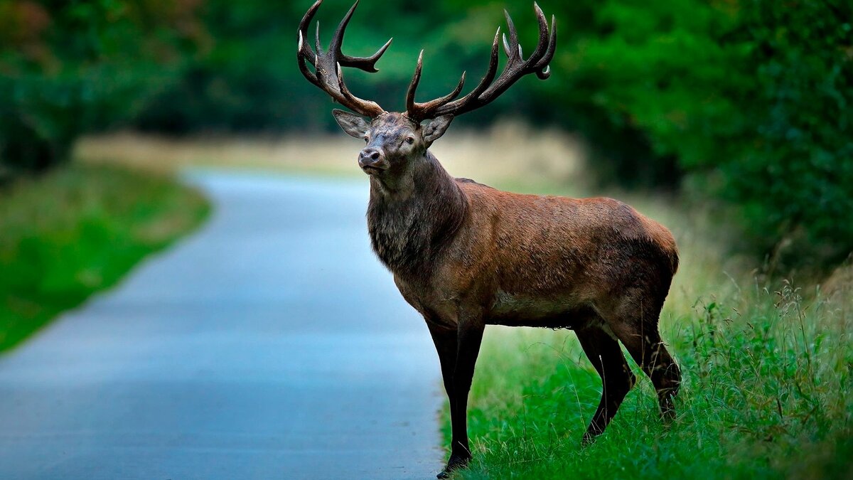 На видео видно, как олень, не обращая внимания на происходящее вокруг, целеустремленно трусит по обочине загородной трассы навстречу движущемуся транспорту.