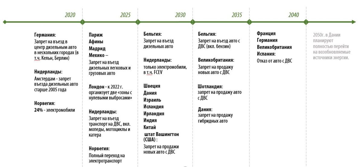 Самым долгим переходом на электротранспорт отметилась Франция. Страна готова отказаться от топливных авто только к 2040 году. Но в некоторых регионах дизельные авто, собранные раньше 2011 г., запретят уже в 2025 г. В Париже закон вступит в силу еще раньше, в 2024 году.