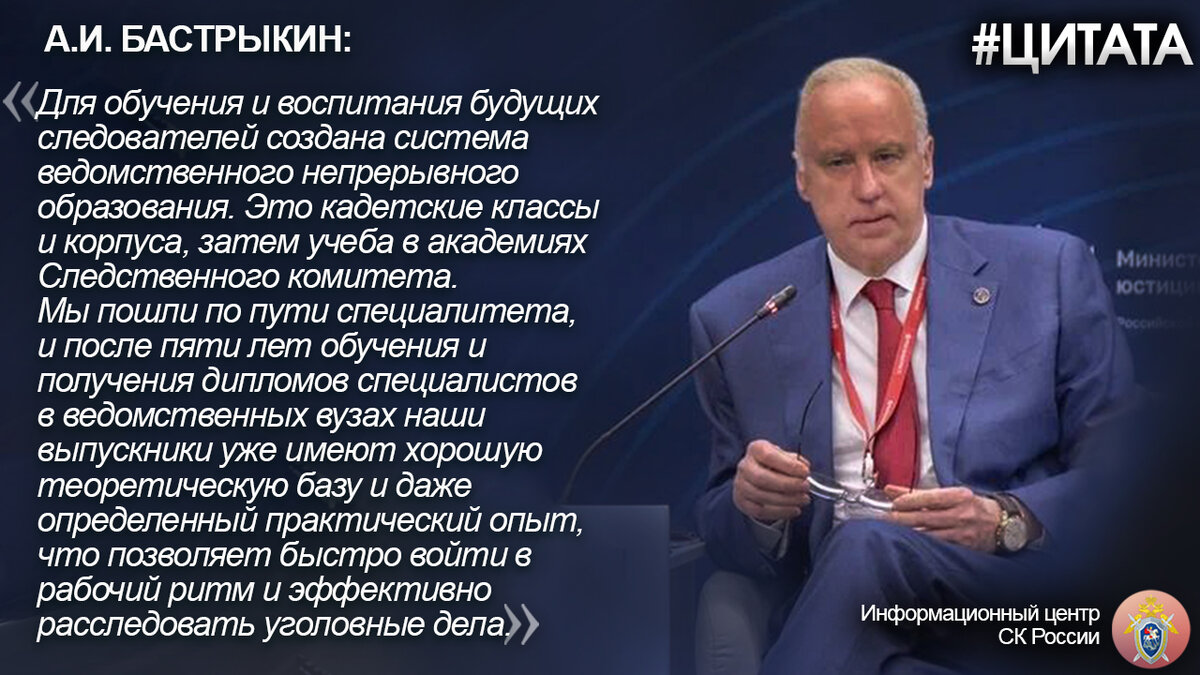 А.И. Бастрыкин: «Для обучения и воспитания будущих следователей создана система ведомственного непрерывного образования. Это кадетские классы и корпуса, затем учеба в академиях Следственного комитета. Мы пошли по пути специалитета, и после пяти лет обучения и получения дипломов специалистов в ведомственных вузах наши выпускники уже имеют хорошую теоретическую базу и даже определенный практический опыт, что позволяет быстро войти в рабочий ритм и эффективно расследовать уголовные дела». ➡ из интервью РИА Новости на ПМЮФ о недостатках Болонской системы образования, важности морально-нравственного воспитания детей, и почему нужно ограничить показ сцен насилия на ТВ #ЦитатаБастрыкина #ЦИТАТА #БолонскаяСистема