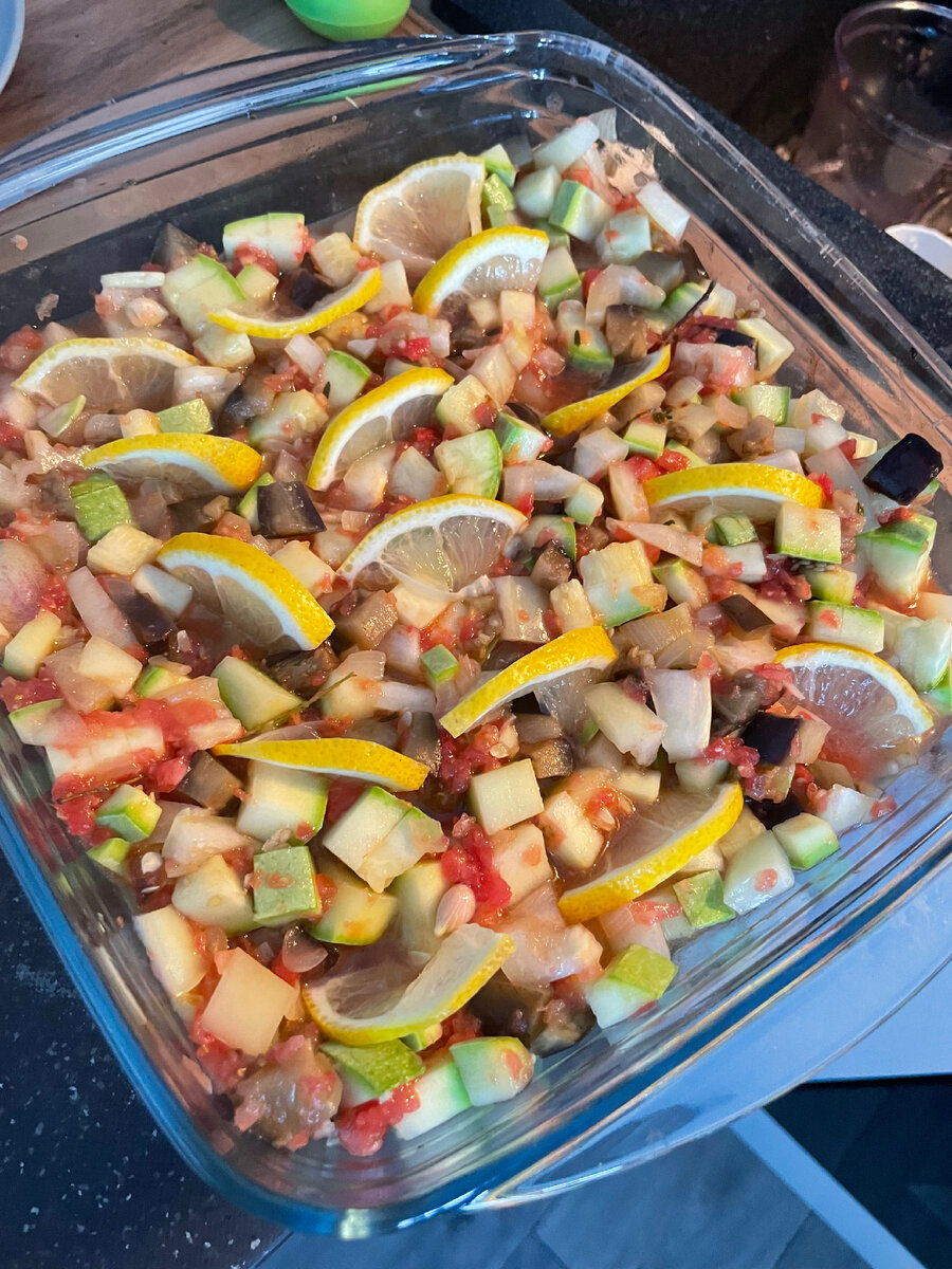 Всем 🤝 привет! Приготовим мы рататуй , не привычным для нас способом, не будем жарить, а будем запекать. Обязательно попробуйте и если понравится, жду от вас подписку и 👍 Нам понадобится: Первое что нам необходимо сделать это налить масло в форму и отправить на несколько минут в духовку, что бы хорошенько разогреть. А мы пока быстро подготовим лук нарежем его кубиками.Как только масло подогреется(я запекаю на 180 градусах), что бы начало шкварчать закидываем кубики Лука и отправляем опять в духовку.Пока лучок поджаривается, чистим и режим кубиками чеснок.Лук необходимо помешать несколько раз, что бы хорошо поджарился, прям с корочкой. Режем кубиком 🍆 баклажан, и отправляем в духовку мин на 5,пока режем кабачки, выкладываем в форму к остальным овощам и отправляем в духовку, мин на 5. Тем временем режем перчик так же на кубики.Отправляем в духовку, а тем временем ошпарим помидоры кипятком и перекрутим а блендере с солью и сахаром( по вкусу).Режем лимончик. Все заливаем помидорами, вты