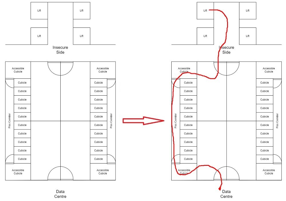 Penetration test (pentest или пен-тест) — тестирование на проникновение в помещение с целью проверки системы безопасности объекта на физическую уязвимость. Такому тесту подверг центр обработки данных специалист по кибербезопасности Эндрю Тирни (Andrew Tierney). Отчет о проделанной работе он разместил в серии твитов под ником @cybergibbons. “Один из моих любимых экспериментов – физический доступ в центр обработки данных через туалеты. Позволь объяснить. Мне нужно было получить доступ с менее защищенной стороны подвального этажа в более защищенную зону”. Изучив открытые планировочных документы Андрю нашел поэтажный план здания и обнаружил, что туалеты спроектированы со легкосъемными панелями и имеют небольшой коридорчик вдоль задней стороны каждого ряда кабинок для доступа сантехников. И этот коридор сопрягался с “защищенным” офисом центра обработки данных. “Получив доступ к общедоступной стороне, я вошел в туалет. Из доступной кабинки в коридор вела скрытая дверь. Я открыл ее и пошел да