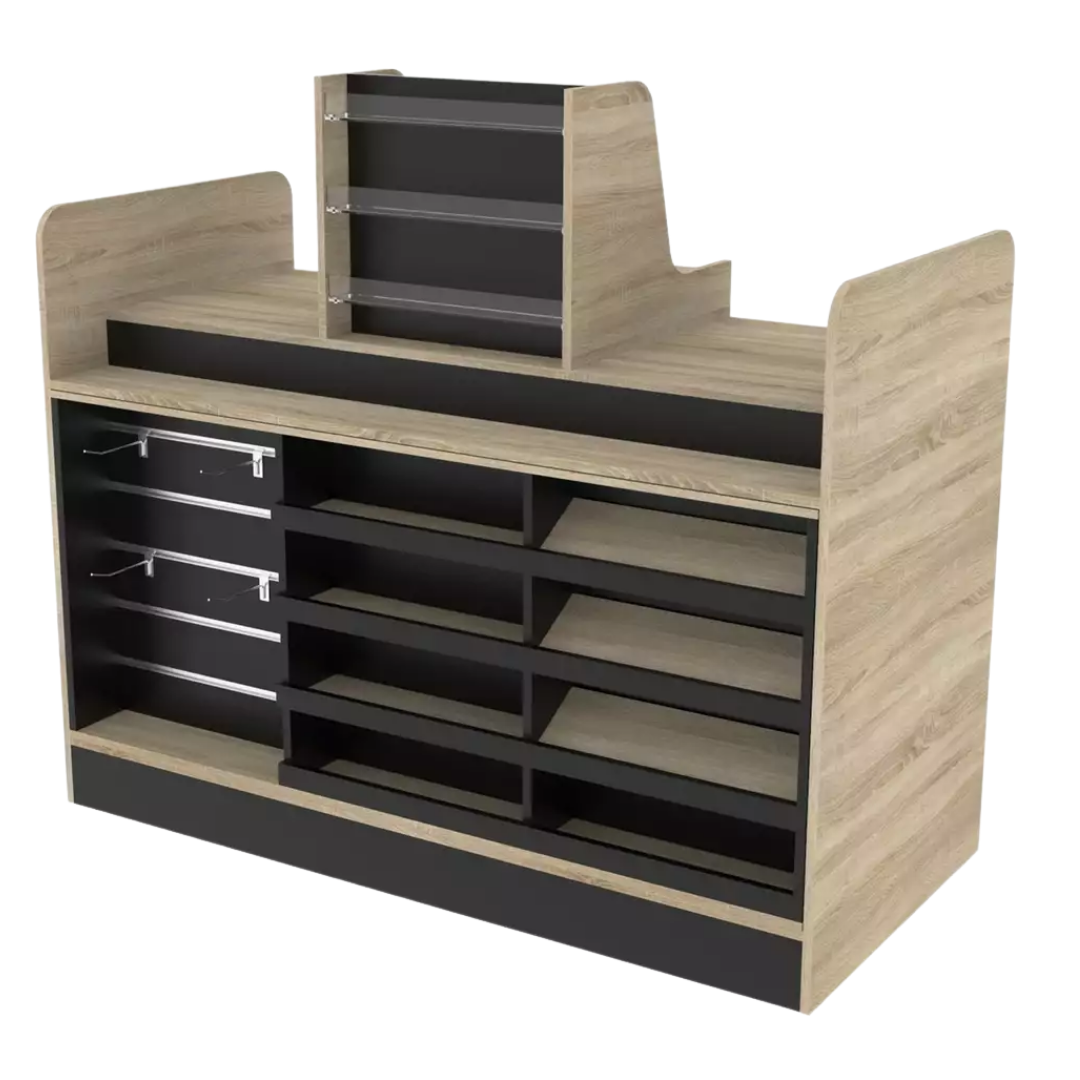 «КМ-2» предлагает фронтальные полочки, расположенные под прямым углом или наклоном, каждая полочка имеет ограничитель, на них можно наклеить ценникодержатели, также во фронтальной – фасадной части можно разместить экономпанель с крючками для импульсных товаров и это все базовые сборки, предусмотренные для данного модуля. Возможна установка подсветки полок модуля по желанию заказчика. 💰 Кассовый модуль состоит из трех составных модулей : базовый модуль, стеллаж вставка и надстройка кассы. 💰 Базовый модуль может быть выполнен в 2-х конфигурациях: 🔻 с открытыми полками со стороны кассир