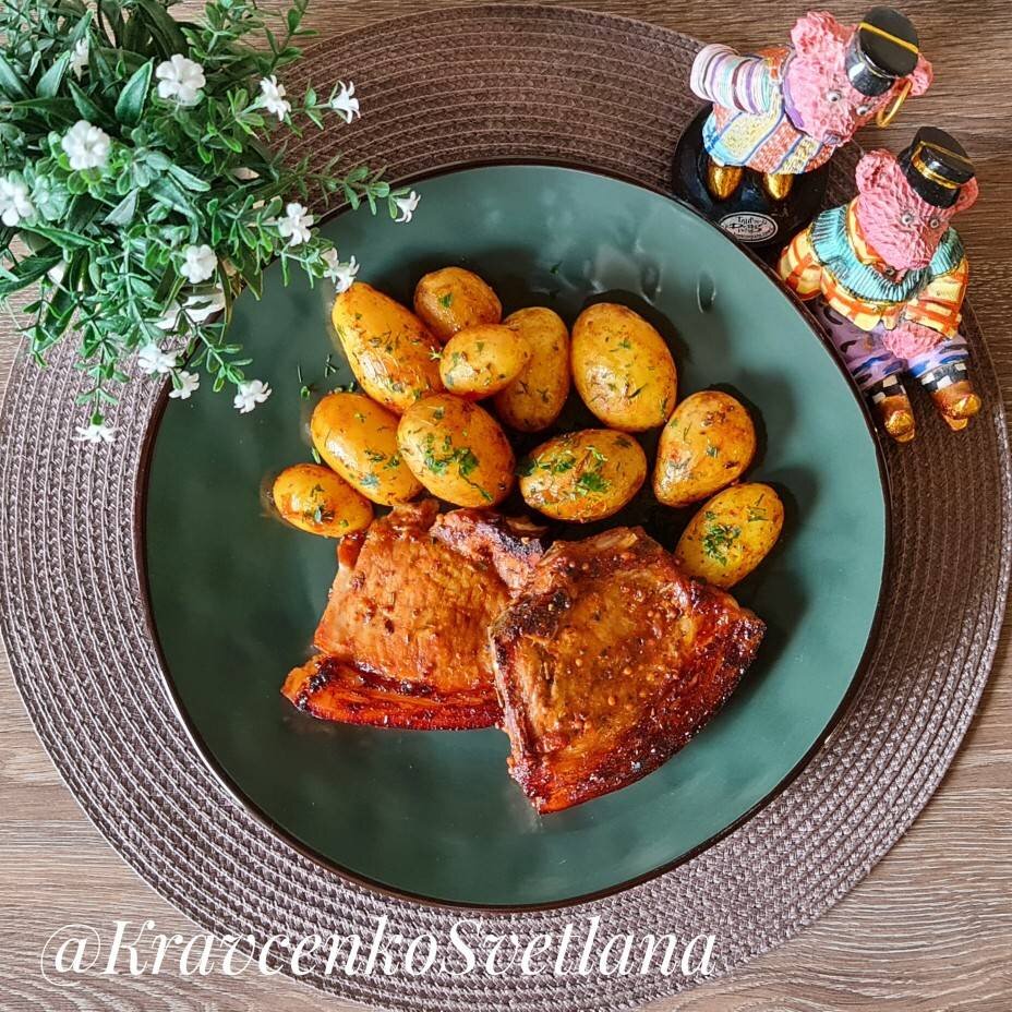 #пятница #кукпадготовит Потрясающе вкусная и нежная свинина. Блюдо подходит как для праздничного стола, так и для будней. За вдохновение спасибо @Sveta_ly Ингредиенты: свинина, картофель беби, для соуса:, кетчуп, соевый соус, сахар или мёд, копченая паприка, прованские травы, горчица, соль, перец Способ приготовления: Для соуса смешиваем все ингредиенты. Мясо со всех сторон промазываем соусом. В форму выкладываем картофель (предварительно хорошо вымытый), обмазываем нашим соусом. Сверху выкладываем мясо, выливаем остатки соуса. Форму отправляем в рукав. Запекаем в духовке при 180-200 С 60 минут. Приятного аппетита!