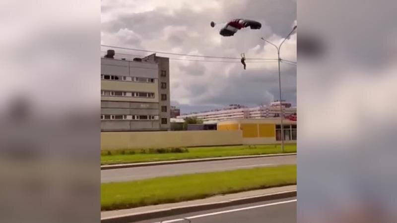 Непонятно откуда взявшийся парашютист спикировал на Суздальский проспект — видео