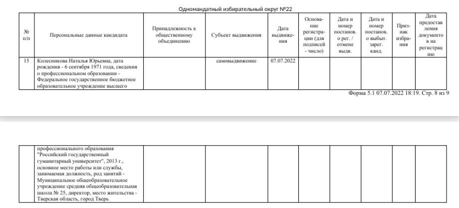 На выборах в Тверскую городскую думу объявился первый самовыдвиженец — Наталья Колесникова, директор школы № 25. Правда есть одна проблемка — она участвовала в праймериз по одномандатному округу № 22 и заняла третье место, набрав фантастические 38 голосов. По всей видимости, это коллектив школы, плюс родственники.