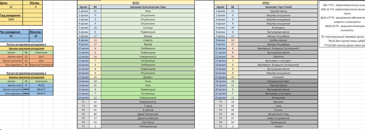 Ну и впринципе - показываю что таблицей №2 можно считать не только совместимость супругов но и вычислить посмертный путь или введя даты начала конца какого то дела - посмотреть по кармическим узлам а к чему оно собственно выльется. Но здесь вбиты даты рождения-смерти и вопрос стоит о обстоятельствах и карме - ну тут четко совершенно 1 узел кармы в 13м доме, в аркане Смерть\Трансформация..тут впринципе можно считать что сгорел в поездке на работу. или в процессе работы. И впринципе, учитывая что балл итога находится в зеленой по модулю зоне - можно говорить что для его посмертия это даже и плюс, по крайней мере отдельный подсчет суммы 3 блока - он дает +0,78 к карме в данном случае атмана, то есть духа. На уровень выше пойдет дух сей.