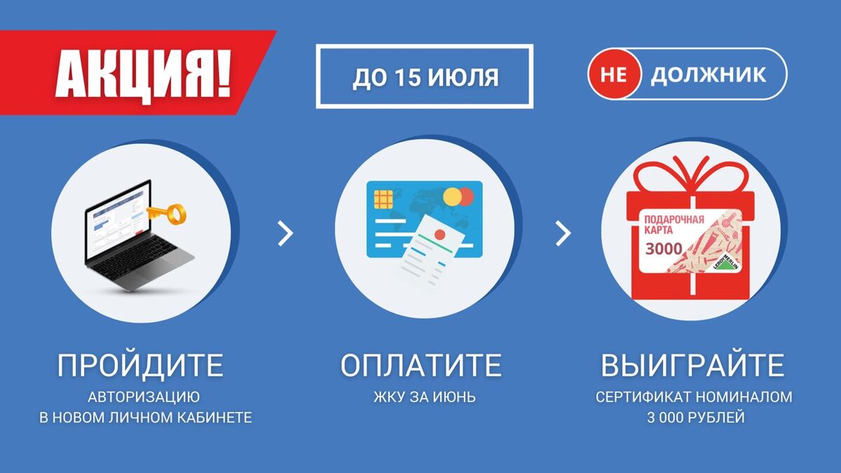 Портал Недолжник.рф продолжает дарить подарки! Пройдите авторизацию и полностью оплатите ЖКУ за июнь до 15 июля в новом личном кабинете https://лк.недолжник.рф и выиграйте сертификат «Леруа Мерлен» на сумму 3 000 рублей. Условия акции: 🎯4 победителя получат подарочные сертификаты «Леруа Мерлен» номиналом 3 000 рублей; 🎯 Чтобы получить шанс на выигрыш, нужно быть авторизованным или пройти авторизацию в новом личном кабинете и оплатить ЖКУ за июнь до 15 июля на портале недолжник.рф; 🎯Отправьте заявку на участие со словом "акция" с указанием номера лицевого счёта в чат на портале недолжник.рф. Итоги будут подведены 18 июля в 15.00. "Уважаемые жители! Благодарим вас за своевременную оплату жилищно-коммунальных услуг. Участвуйте в акциях и выигрывайте призы! Рекомендуем вам оплачивать ЖКУ через новый личный кабинет портала недолжник.рф. Это просто и удобно", - поделился руководитель УК "Центрстрой" Валерий Бахчурин. #недолжнк #жкх #центрстрой #валерийбахчурин