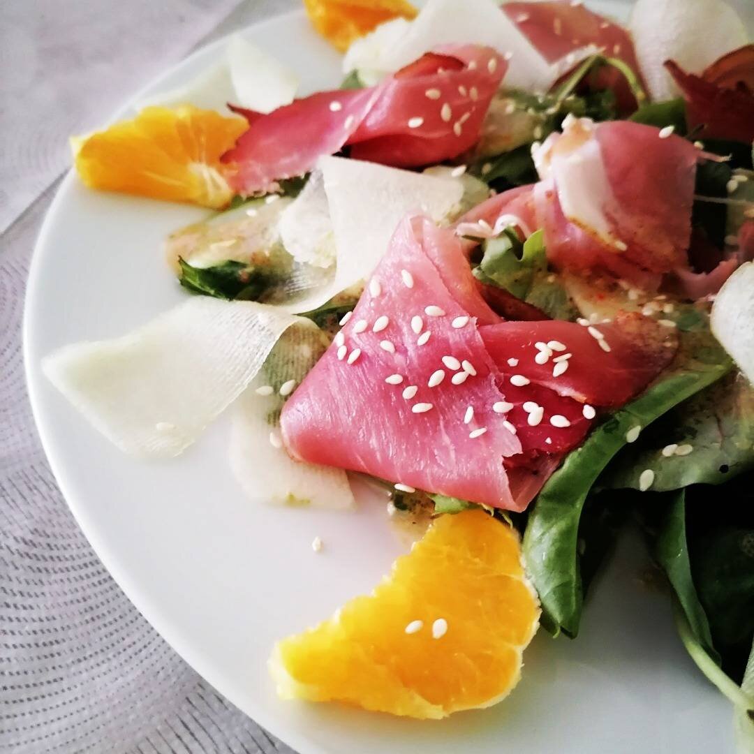 Ингредиенты: Мікс салат, Груші, Апельсину, Огірків, Прошуто/шинка, Оливкової олії, Соєвого соусу, Діжонської гірчиці, Сік лайму/лимону, Сіль, перець , Насіння конжуту