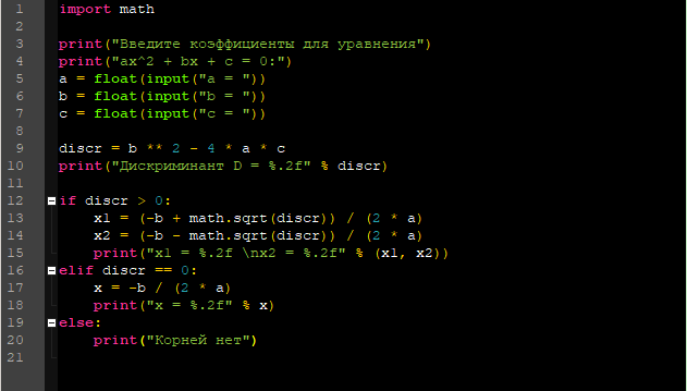 Квадратное уравнение имеет вид ax2 + bx + c = 0 При его решении сначала вычисляют дискриминант по формуле D = b2 - 4ac Если D > 0, то квадратное уравнение имеет два корня; если D = 0, то 1 корень; и если D < 0, то делают вывод, что корней нет.