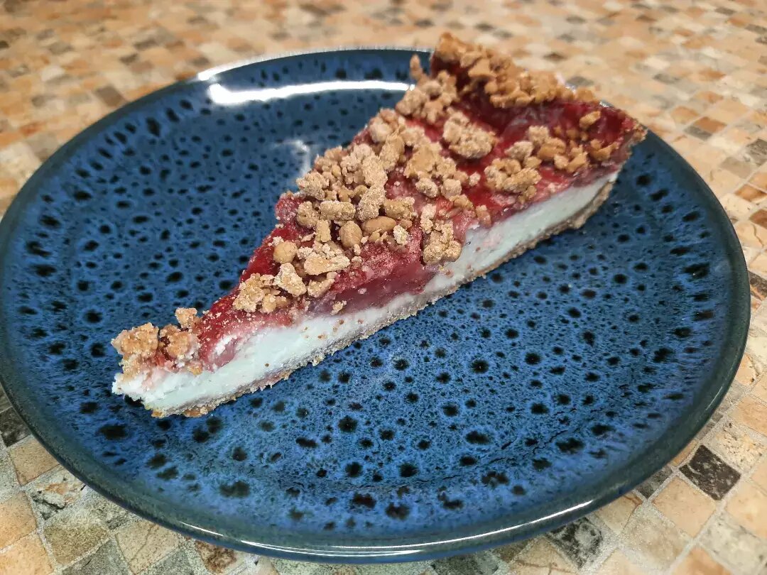 Ингредиенты: Тесто:, Яичные желтки, Кефир, Рисовая мука, Какао , Подсластитель, Начинка:, Яичные белки, Рикотта, Греческий йогурт, Крахмал кукурузный, Ванилин, Подсластитель, Клубничный конфитюр:, Клубника замороженная, Вода, Земляника свежая, Крахмал кукурузный, Подсластитель Способ приготовления: Для конфитюра разморозить и пюрировать ягоды (можно взять свежие), смешать с водой и подсластителем. Добавить разведенный в небольшом количестве воды крахмал, варить на медленном огне несколько минут до загустения. Для начинки взбить белки, добавить остальные ингредиенты, всё хорошо перемешать. Для теста перетереть ингредиенты в крошку. Часть теста распределить по дну формы, залить начинкой, сверху аккуратно выложить конфитюр, затем посыпать оставшейся крошкой. Выпекать в разогретой до 180° духовке 40-60 минут до готовности.