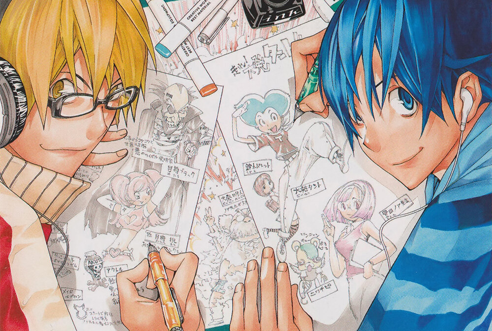 Манга от авторов культового произведения "Тетрадь смерти". В России её выпустило издательство "Азбука", манга у нас уже полностью издана. В русском издании томов 10, хотя на самом деле их 20, но поскольку мангу выпустили в твердом переплете, то в одном нашем томе - два японских. Данную мангу я считаю обязательной к прочтению всем, кто вообще только знакомится с мангой. И сейчас я расскажу почему. Сюжет нам рассказывает о подростках, которые начинают дружить и вместе работать ради общей мечты - стать лучшими мангаками(авторами манги) и завоевать мировое признание. Путь их тернист и долог, но на этом пути они обзаводятся новыми друзьями и соратниками. Я советую ее читать новичкам потому, что здесь показывается весь процесс создания манги. От написания сюжета, рисования раскадровки, согласования с редактором, многочисленными правками и так далее. За самим процессом очень интересно наблюдать и приходит понимание какой же адский труд нарисовать даже одну страницу, не говоря уже о тридцати к