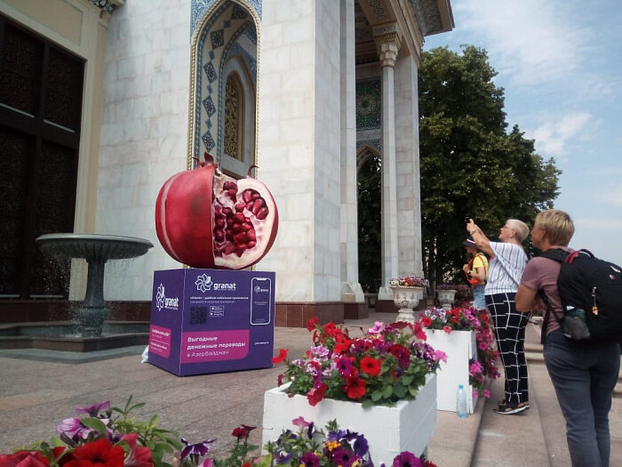 Очень красный, очень сочный и очень яркий. Огромный гранат вырос на главной аллее ВДНХ перед павильоном Азербайджан. Оригинальный арт-объект в виде разломленного граната - это плод сотрудничества павильона Азербайджан с российским банком. С первого дня этот король восточных фруктов привлекает внимание москвичей и гостей столицы, отдыхающих на ВДНХ. В этом убедился портал «Москва-Баку». Сайт "Москва-Баку": https://moscow-baku.ru/news/society/plod_druzhby_rossii_i_azerbaydzhana_poyavilsya_na_vdnkh_reportazh_moskva_baku/