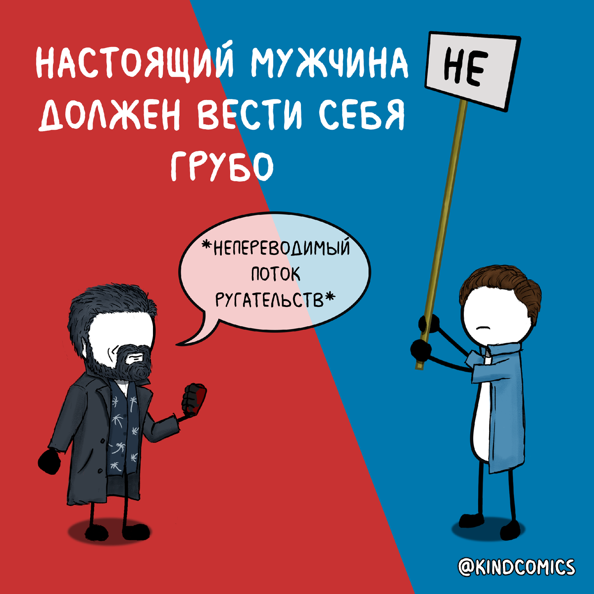 Сегодня на связи Виталик, автор и художник Добрых Комиксов, и я хочу поделиться с тобой важной для меня темой. Мы с детства привыкаем слышать от родителей и окружения, что мальчик должен то, должен это. Инаковость и "не мужское" поведение порицаются и высмеиваются. Что мы получаем в итоге? Мальчики вырастают в мужчин, скованных цепями стереотипов разной степени тяжести, которые очень трудно с себя сорвать. А с возрастом всё чаще любые изменения и новшества в поведении, образе жизни и предпочтениях проходят через сомнения вида "Да не, зачем, я ж нормальный мужик....или нет?" (не удержусь от соблазна тут вспомнить Слепакова и его зимний трек). И порой очень хочется что-то в жизни поменять, потому что то, как есть, не нравится и/или не приносит радости, но не знаешь, как. А главное - очень страшно обратиться к кому-то за помощью и рассказать о своих проблемах, ведь это не "по-мужски". Я хочу напомнить тебе, что даже если в детстве особого выбора не было (не мы определяем среду, в котор