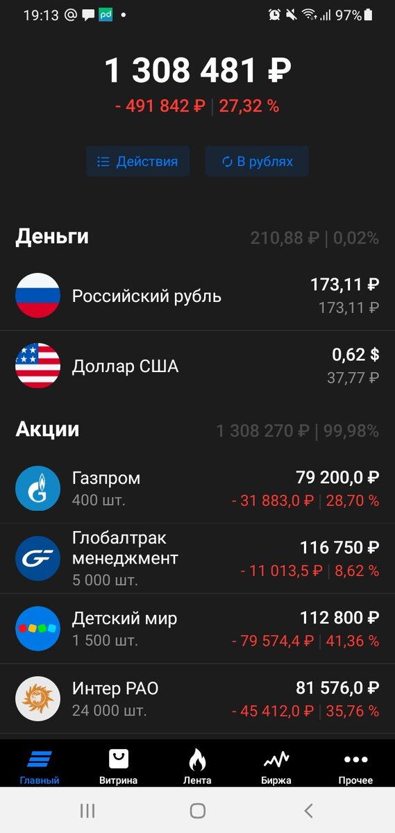 На вырученные деньги приобрела 2000 акций Глобалтрак менеджмент в дополнение к 3000 имеющихся доведя среднюю цену до 25,55 руб. и 100 акций Распадской по +274 рубля за штуку. Так совпало, что на новостях об аварии на небольшой шахте Распадской в день покупки акций котировки слегка приуныли, купила, можно сказать с дисконтом т.к. к вечеру пятницы стоимость Распадской зафиксировалась уже к 297 руб. Учитывая, что в середине мая продавала 200 штук Распадской по 376 руб. можно сказать удачно вернулась в позицию.