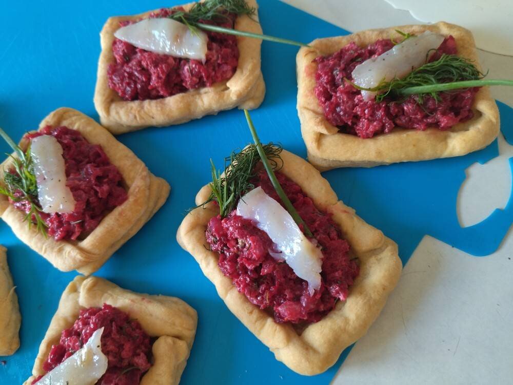 #меню #летнийсалат #кукпадготовит #суббота Эта закуска встретилась мне на вырезках из журнала "Крестьянка" давних-придавних времён, когда внутренний Плюшкин подсказывал, что идеи лишними не бывают, а всё любопытное пригодится. Ингредиенты: готового слоёного теста, маленьких свёклы или 1 большая, чеснока, перьев зелёного лука, свежего укропа, слабосолёной рыбы, сметаны, Соль Способ приготовления: Сначала о рыбе. Успешно подходит всеми любимая селёдка. Но у нас была припасена баночка сугудая из муксуна. Оказалось очень удобно и ускорило дело в разы. Для начинки лоточков кусочки рыбы порезаны мелко. И несколько (по одному на каждый лоток) продолговатых ломтиков - на подачу. Тесто раскатать тонко, но без разрывов. Вырезать прямоугольники, примерно 7 *4 см. И "рамки", по 1 см. и с пустотами внутри. Прямоугольников и рамок - равное число. Из остатков теста - полоски 1 см шириной. Края прямоугольных заготовок смочить водой, прилепить поверх рамки. Их поверхности тоже смочить. На них - полоски