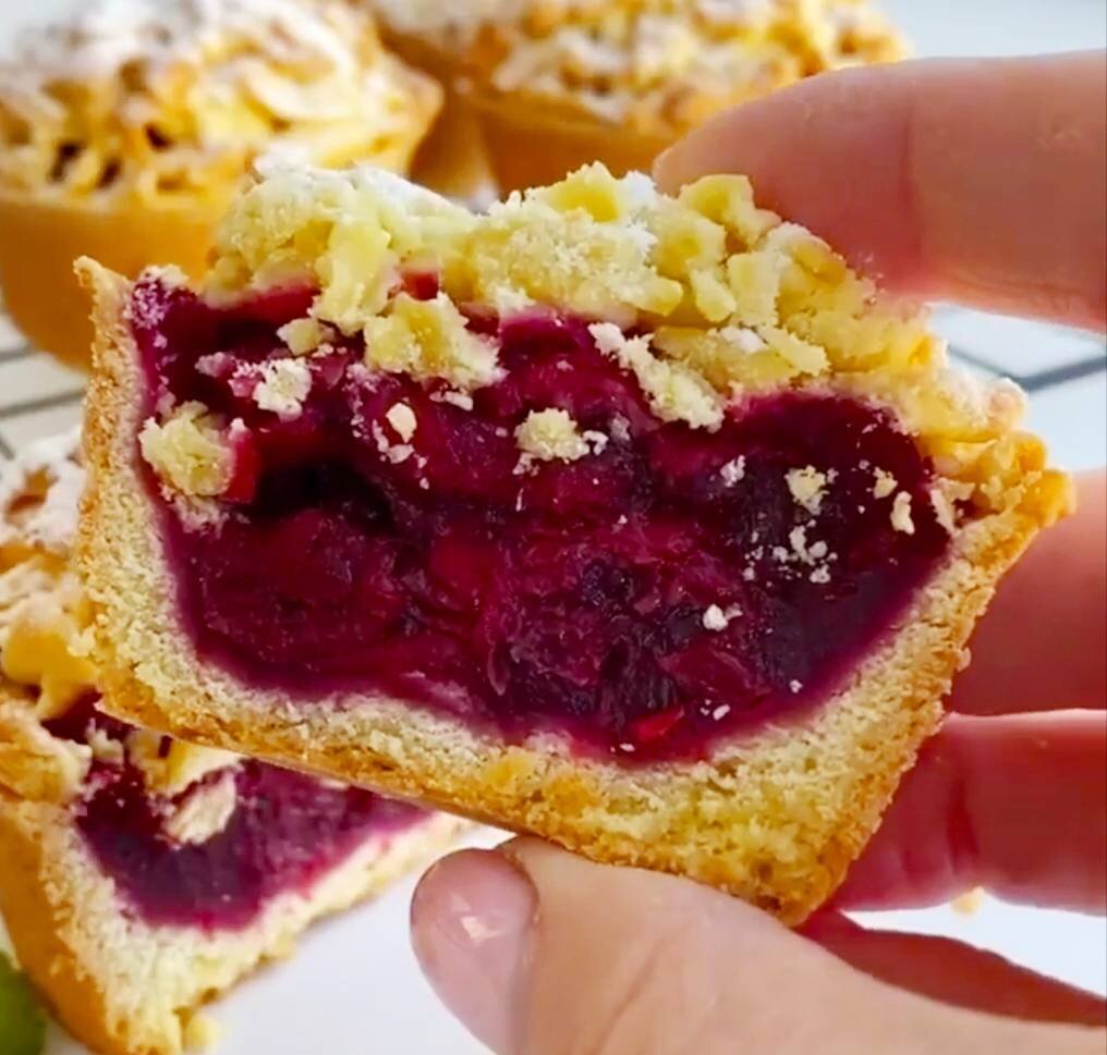 Ингредиенты: творога, яйцо, мягкого сливочного масла, сахара, муки, соды, соли, Начинка, сахара, кукурузного крахмала, вишни. Можно размороженную Способ приготовления: Соединить яйцо, мягкое масло, творог, сахар, соль и пробить блендером до однородной консистенции. Добавить муку, соду и замешать мягкое, эластичное тесто. Разделить его на две части 3/2. Меньшую в пакетик и отправить в морозилку. А из большей формируем 6 корзинок в форме для кексов. Приготовление начинки. Соединить вишню, сахар, крахмал перемешать и отправить на средний огонь. Постоянно помешивая довести до кипения. После этого варить 2-3 минуты. До загустения. Снять с огня и и остудить. После остывания разложить в корзинки. Достать замороженное тесто и натереть на крупной тёрке. Посыпать им сверху корзинки. Отправить в духовку на 20-30 мин при 180°. Дать приостыть и можно подавать. Можно посыпать сверху сахарной пудрой.