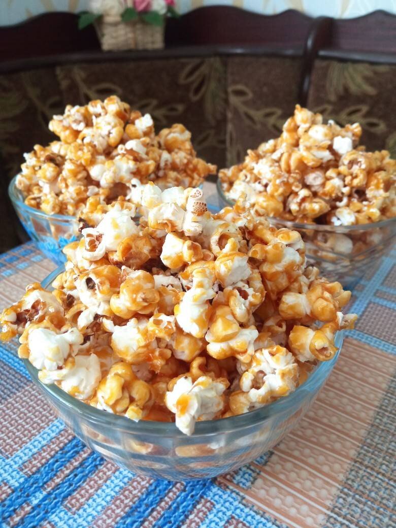 Ингредиенты: зерен кукурудзи, олії, цукру, води, вершкового масла, солі, соди Способ приготовления: Розігріти сковороду, налити масло, додати зерна кукурудзи, перемішати. Накрити кришкою і не відкривати, поки не стихне дикий танець повітряної кукурудзи. Тепер готуємо карамель: у кастрюльку з товстим дном насипаємо цукор і вливаємо воду. Варимо без помішування до гарного карамельного відтінку на середньому вогні. Додаємо масло і сіль, перемішуємо. Додаємо соду, перемішуємо - маса почне дуже пінитися. В цей момент виливаємо її в готовий поп-корн і вимішуємо ложкою, щоб все рівномірно покрилося карамеллю. Перекладаємо на жаровню, застелену пергаментним папером, чекаємо кілька хвилин, щоб вистигли і розділяємо великі шматки карамельного поп-корна на меншенькі. Насолоджуємося!