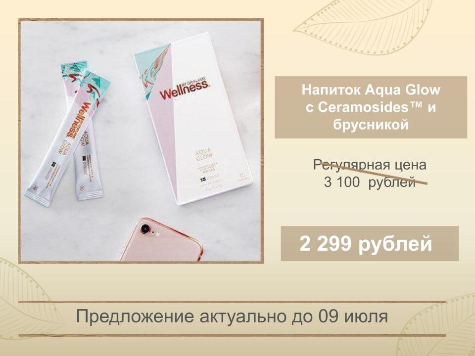 А знаете ли вы, что обезвоженность называют первым признаком старения кожи? Что делать ? Использовать дары природы! Керамиды – главная липидная составляющая поверхностного слоя кожи. Они помогают предотвращать обезвоживание кожи. Их значимость объясняется их способностью поддерживать в коже нужный уровень увлажненности. Ключевым ингредиентом Напитка " #AquaGlow c Ceramosides™ и брусникой» является CeramosidesTM – это ингредиент, который содержит фитокерамиды пшеницы, которые по своей молекулярной структуре схожи с клетками кожи. Именно CeramosidesTM помогает сохранять нашу кожу гидратированной, сохраняя влагу и предотвращая обезвоживание кожи. Также еще в составе есть : ● Брусника — это шведская суперягода, богатая антиоксидантами, которая защищает кожу от негативного воздействия свободных радикалов, вызывающего преждевременное старение кожи. ● Витамин B3 способствует поддержанию нормального состояния кожи. ● Витамин С поддерживает синтез коллагена, структурного протеина