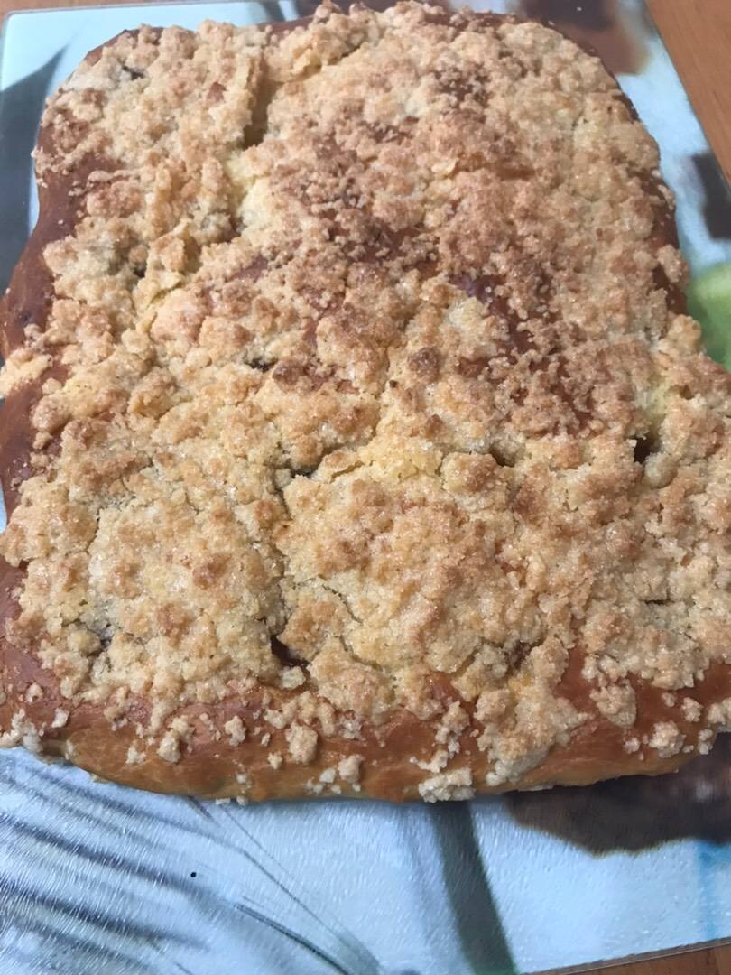 #меню Просто волшебный вкус у этого пирога, к тому же он воздушный. Для начинки можно взять любое варенье, повидло, джем. Ингредиенты: тёплого молока, живых дрожжей, сахара, соли, яйца, растопленного сливочного масла, муки, повидло яблочное (любое варенье), штрейзель (крошка):, мягкого сливочного масла, муки, сахара Способ приготовления: В тёплом молоке развести живые дрожжи с сахаром. Далее добавляем яйца, щепотку соли и растопленное сливочное масло. Просеиваем муку и замешиваем вязкое тесто, как густая сметана. Я слегка смазала растительным маслом пергамент. Далее распределить тесто по пергаменту не тонким слоем. Пальцем, смоченным в раст.масле наметить дырочки. Затем в них разложить начинку. Готовим штрейзель: перетираем руками в крошку муку, сливочное масло и сахар. Штрейзелем посыпаем пирог сверху. Выпекаем при 180 градусах 25-30 минут. Пирог получился очень мягким, воздушным. Вкус будет меняться от начинки.