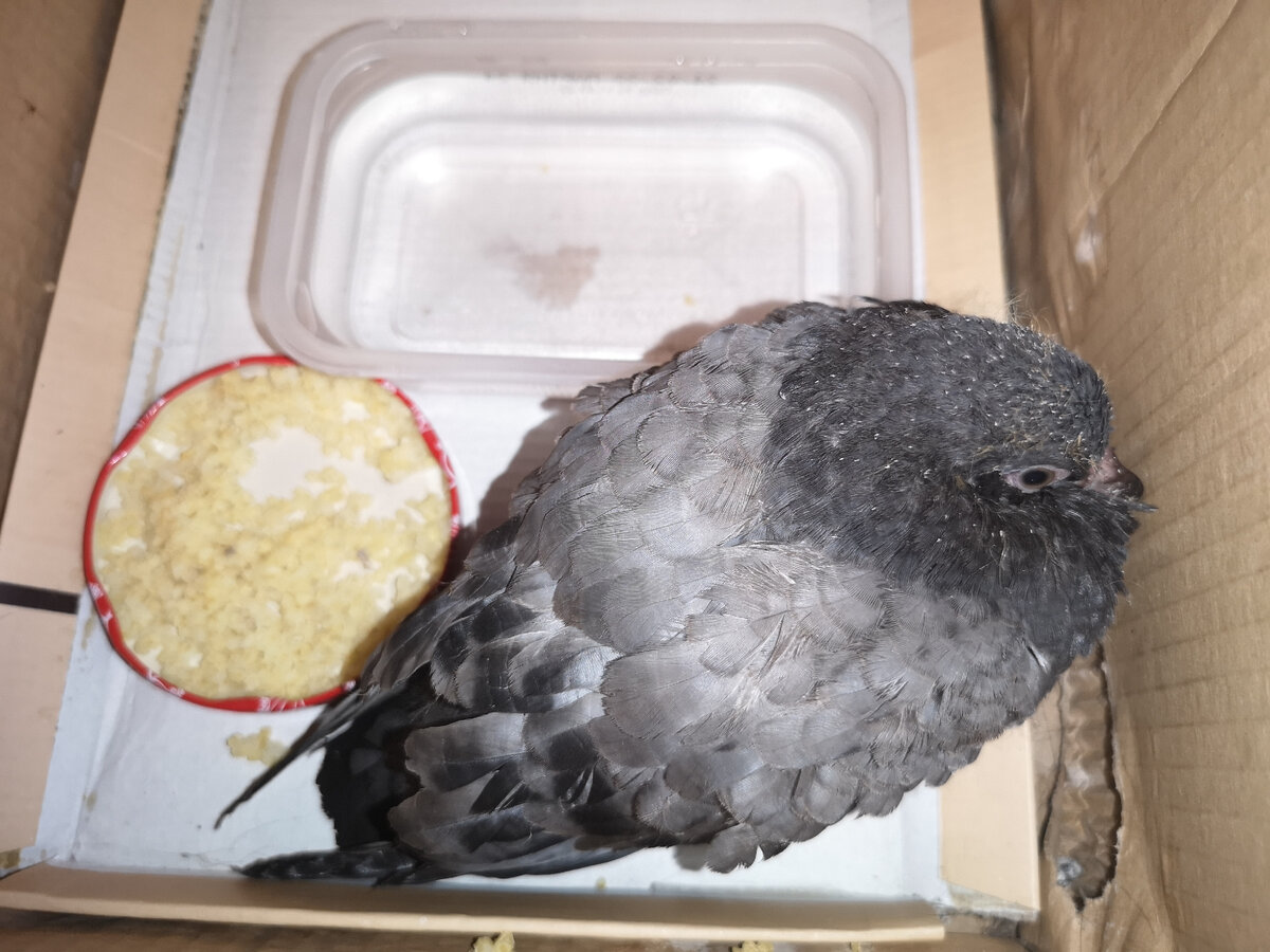 Друзья, кто знает или кто первый раз читает об этом, у нас поселился Птенец Голубя совсем неожиданно.. Об этом я писала уже в предыдущих 2-х статьях: Напомню, что это событие произошло вечером 15 июня, далее были насыщенные сутки адаптации и понимания, что делать дальше... Птенец отличался внешним видом от взрослых голубей, естественно, - это размером, лапки были не розово-красные, а полосатые черные, глаза светло-зелёные, хотя у взрослых они насыщенно-коричневого цвета, хвостик маленький, короче крыльев, под крыльями, на животе, на горлышке ещё не было перьев, на головке ещё виднелся пушок и интересно выглядел его не сформировавшийся клювик... Птенец сначала жил у нас в прихожей, в зал дверь закрывали, а на кухню перегородили путь коробкой и занавеской. Конечно, это было не очень удобно и доставляло дискомфорт, но, мы готовы были с этим мириться. К тому же, убираться приходилось в 2-3 раза больше, но, что ж поделать!... В статье про первые сутки Птенца у нас дома, я уже писала