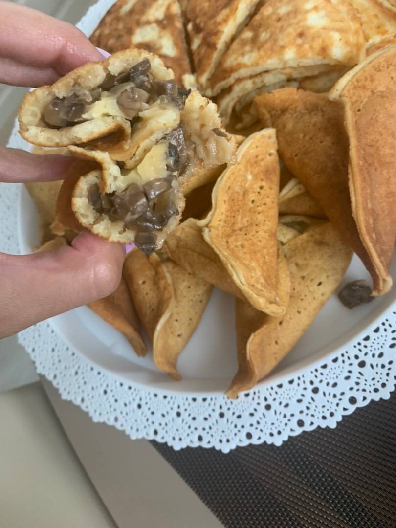 На центр блина выложить ложку грибной начинки, сверху немного тертого сыра. Краешки блинчика соединить вместе таким образом, чтобы получился треугольник. Ничем смазывать края не нужно, они прекрасно соединяются сами по себе. Готовые блинчики сложить на противень. Отправить их в разогретую до 170 С духовку на 10-15 минут, чтобы сыр полностью расплавился. Приятного аппетита 😋.