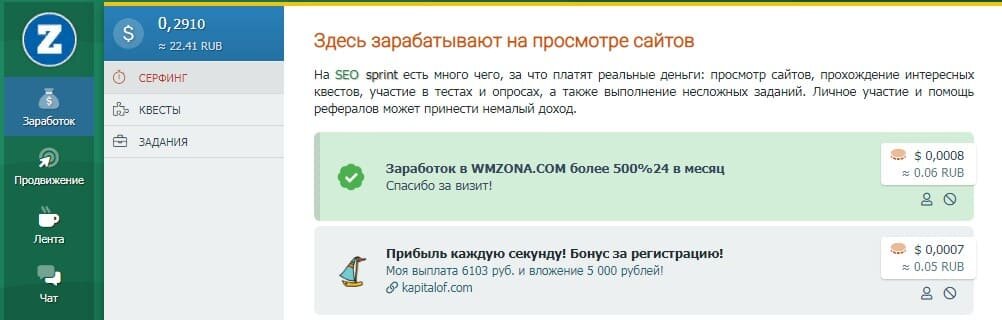 Seosprint.net — система активной рекламы, где можно кликать по ссылкам, проходить квесты и выполнять задания, зарабатывая на этом 100-300 руб. в час без опыта и вложений. В 2021 году Сеоспринт остается лидером ниши Этот сайт — посредник между рекламодателем и работником. Первые здесь заказывают рекламу для продвижения свои проектов, а вторые смотрят рекламу или выполняют задания за денежное вознаграждение Проект был создан 13 декабря 2010 года (апдейт ноябрь 2019). Здесь вы найдёте работу на любой вкус! На сайте колоссальное количество заданий, за выполнение которых, исполнителям платят реальные деньги. Получать небольшую прибыль также можно: просматривая сайты (сёрфинг), и отвечая на вопросы квестов Как здесь зарабатывать На Seosprint для Вас подготовлено три способа заработка. Это официальная цифра, на самом деле, их гораздо больше. Перечислим все виды заработка (от меньшего, к более доходному): Дополнительные способы заработка: Итак, самой прибыльной работой на Seosprint являются оп