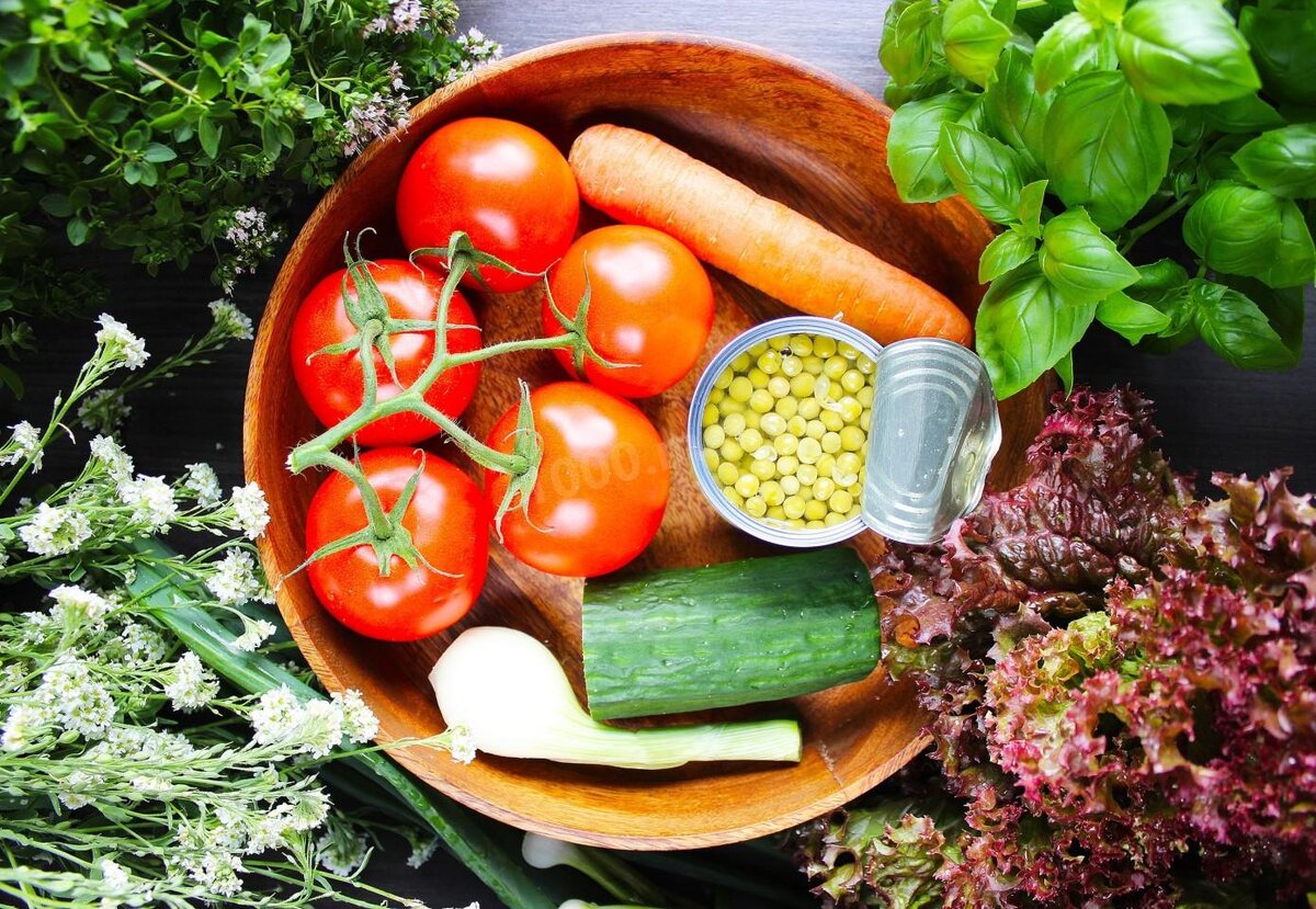 СОСТАВ / ИНГРЕДИЕНТЫ Помидоры (2шт.) Огурцы (1шт.) Лук (1шт.) Морковь (1шт.) Зелёный горошек (150гр.) Листья салата (7шт.) Растительное масло (40 гр.) Соль, перец, зелень (по вкусу) ПОШАГОВОЕ ПРИГОТОВЛЕНИЕ Время приготовления: 10 мин. ШАГ 1 Как приготовить салат из огурцов, помидоров, зеленого горошка? Подготовьте все продукты, которые указаны в рецепте. Горошек у меня консервированный, но вы можете взять свежий молодой горошек. Он так же удачно дополнит все овощи. ШАГ 2 С горошка слейте жидкость. Морковку и лук очистите от кожуры. Листы салата тщательно вымойте, и обсушите. Какие листочки можно взять? Отлично подойдут романо, айсберг, лолло-росса, фриссе, корн и так далее. Огурцы и помидоры ополосните. Если у огурца грубая кожура, то её нужно срезать. ШАГ 3 Листочки салата нарвите произвольными небольшими фрагментами. Отправьте в удобную глубокую салатницу. ШАГ 4 Помидоры и огурцы нарежьте кубиками среднего размера. Также допустимо овощи нарезать тонкими дольками. Сделайте так, как ва
