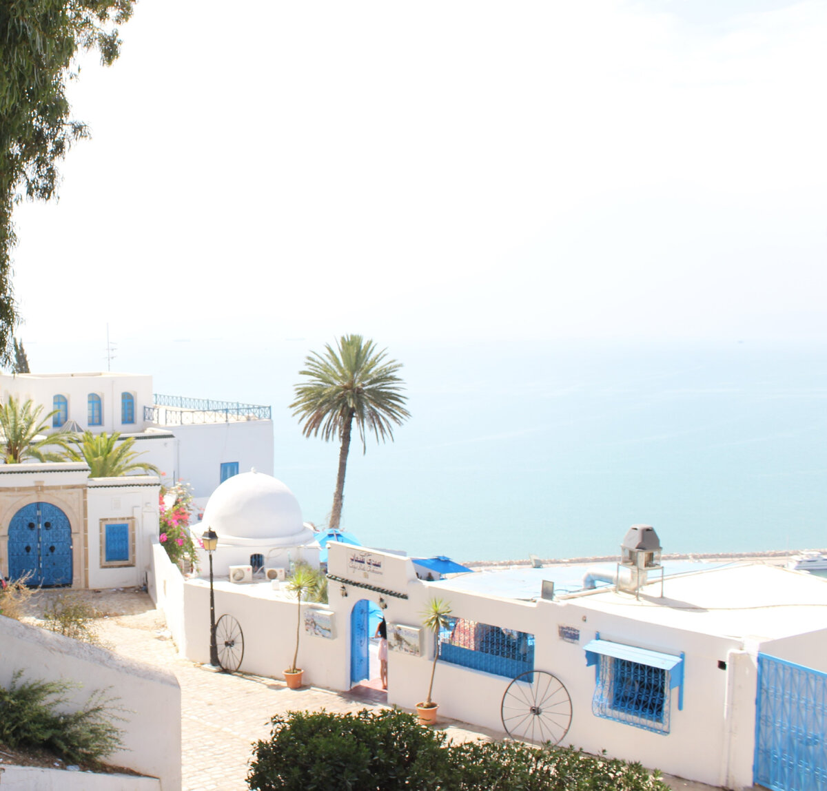 В 20 км от столицы Тунис находится красивый бело-голубой город, город художников, поэтов, романтиков, жемчужина Туниса, город Сиди-Бу-Саид. Сиди-Бу-Саид является одним из самых посещаемых туристами местом. Город находится на вершине утеса, с которого открывается потрясающий вид. Пройдя по узким улочкам, их можно назвать достопримечательностью этого города, перед вами открывается синева Тунисского залива и порт. При желании можно посетить музей арабской и средиземноморской музыки Dar Ennejma Ezzahra - «дом сияющей звезды» и дом-музей тунисского быта Dar el Annabi - «дворец арабских ночей». В уличном кафе можно выпить очень вкусный чай с мятой или что-нибудь похолоднее. В городе очень жарко, всё-таки Африка, и пока вы поднимаетесь по улочкам на вершину утеса, придется попотеть, своего рода фитнес прогулка. Но в конце восхождения вас ждет вознаграждение!! Морской бриз! Блаженство!!! Террасы, выходящие к заливку, можно сравнить с террасами на острове Санторини, в городе Ия. Гуляя по ул