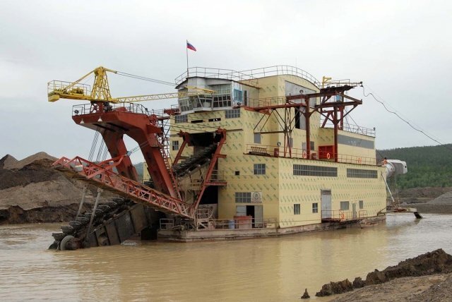 Всем, здравствуйте, мы продолжаем поэтапно разбирать рабочие моменты связанные с инновационной приставкой для качественного извлечения золота МОПС, и сегодня постараемся доходчиво объяснить, способ её установки на драгу, а также озвучим несколько повсеместно встречающихся трудностей. Драга - это комплесно-механизированный горнообоготительный агрегат, работающий по принципу многоковшового цепного экскаватора, установленный на плавучую платформу, имеющий многочерпаковую рабочую раму для подводной разработки. Это огромное плавучее здание, но способ извлечения золота в нём, во многом схож с извлечением на пром.приборах, всё теже шлюзы (колоды) всё теже потери, основные причины которых, мы уже озвучивали ранее. По левой, и по правой палубам драги, проходят хвостовые колоды, в каждой из них можно без проблем установить МОПС, не вмешиваясь и не нарушая технологических процессов, а также в доводке, отходы и потери которой, со словами "для внуков" через корму, устремляются ко дну дражного кар