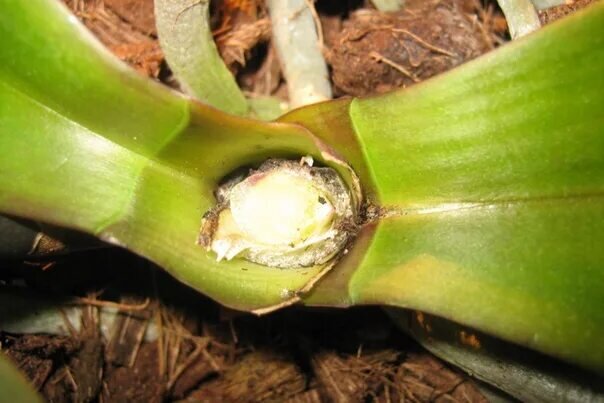 Для того, чтобы гниль не распространилась глубоко внутрь стебля и на соседние листья, повреждённый участок нужно ✂ УДАЛИТЬ ДО ЗДОРОВОЙ ЗЕЛЁНОЙ ТКАНИ. Не бойтесь вырезать сердцевину целиком, без неё растение сможет выжить, а вот процесс гниения может расползтись по всей орхидее, тогда выхаживать будет уже нечего.